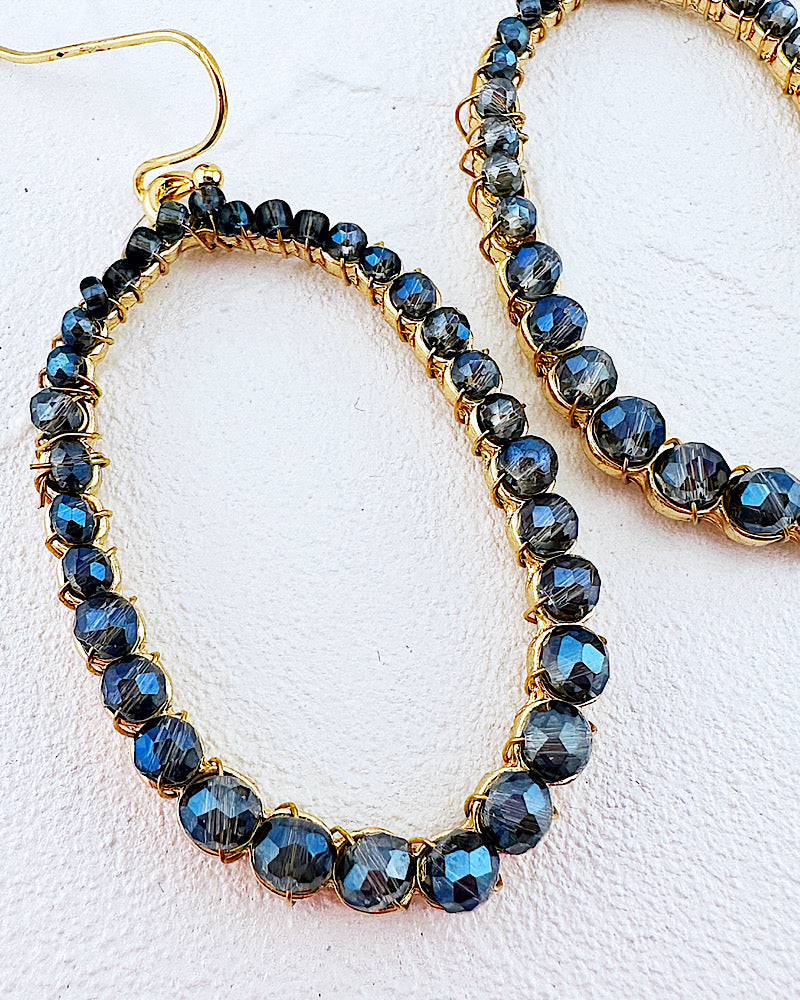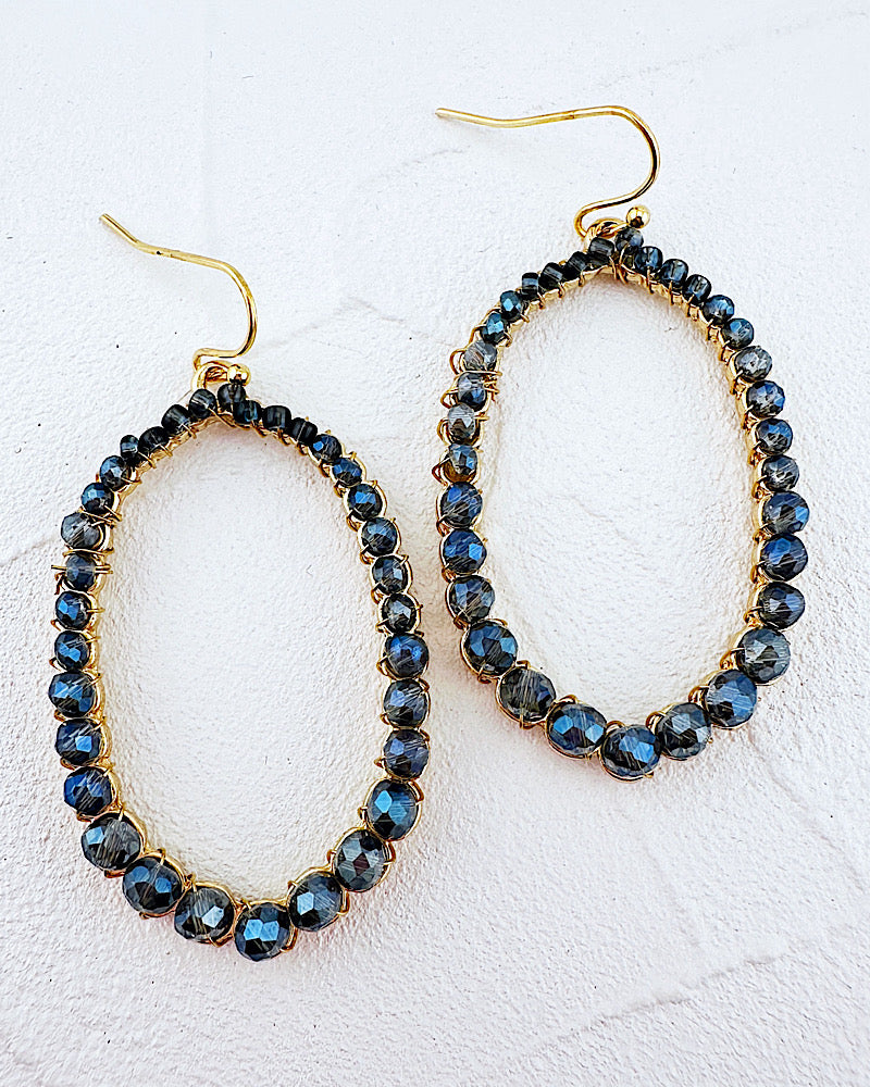 Your newest earring obsession. Nichole is a sought-after silhouette with beautiful blue shimmery crystal beads hand wrapped around the open frames. French wire style, 2-1/8" drop.