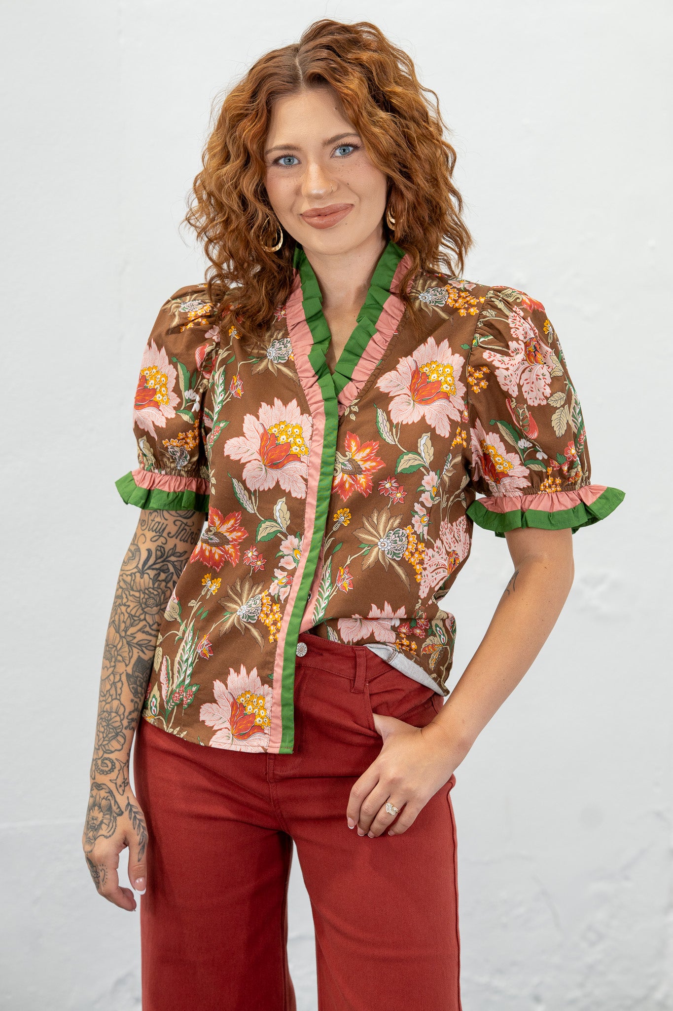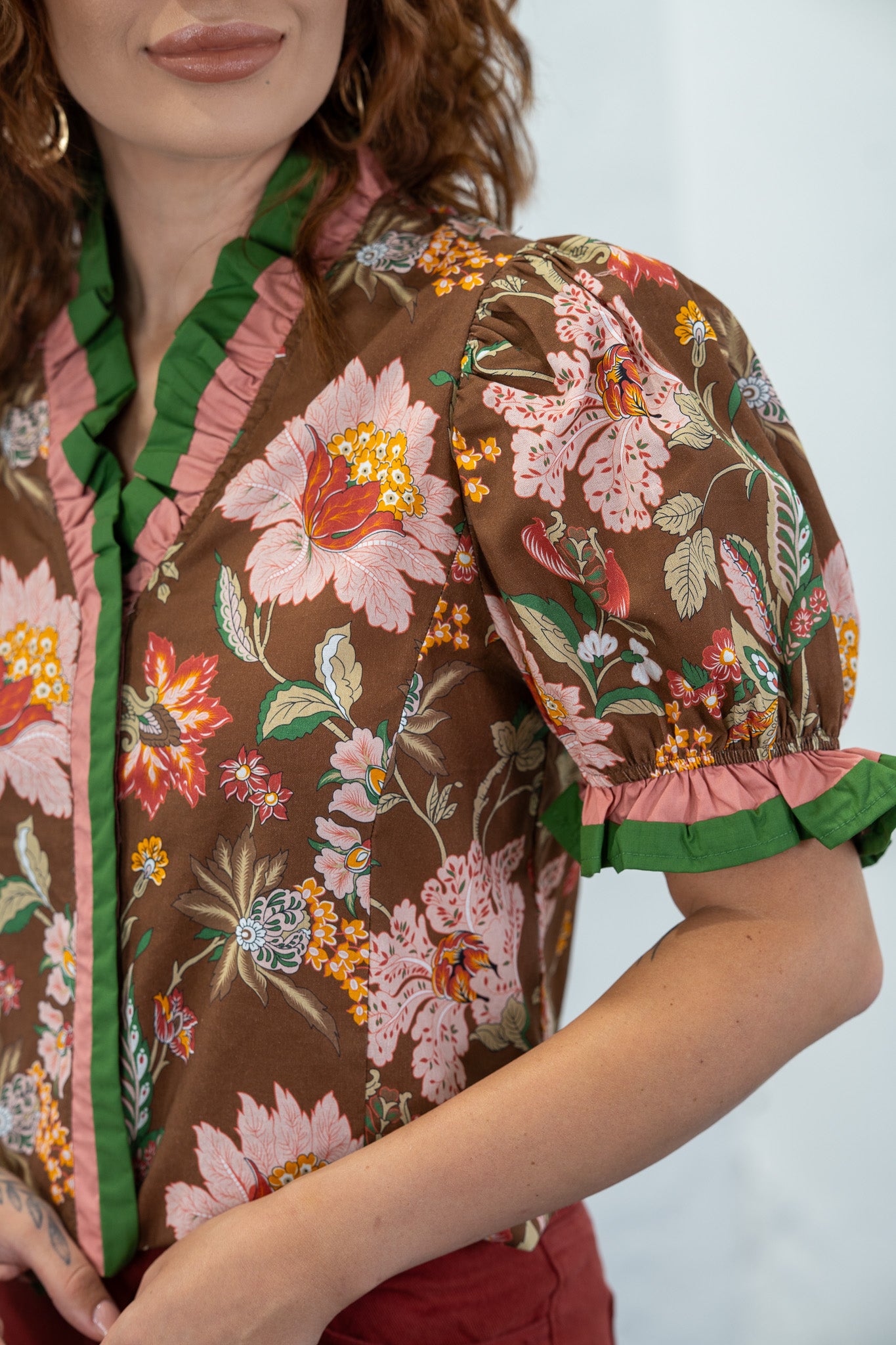Ruffle in solid contrast colors, pretty florals and working button snaps up the front!