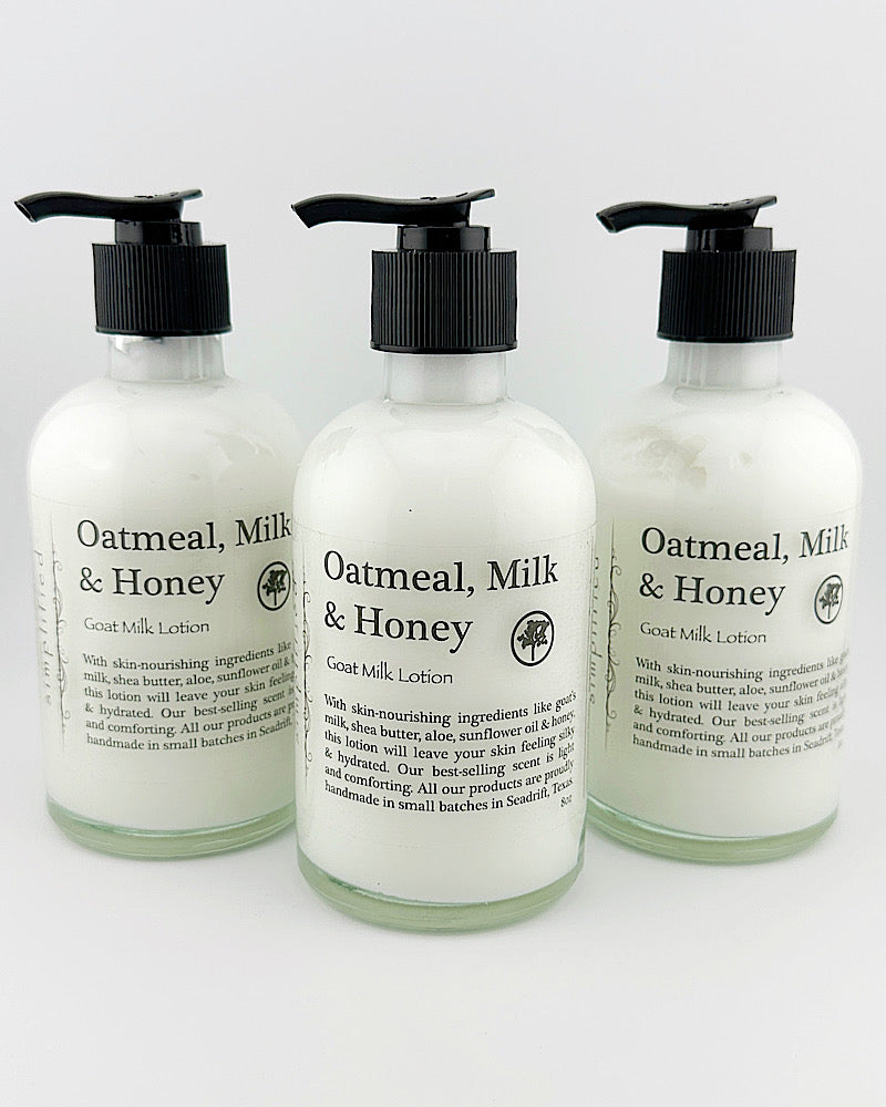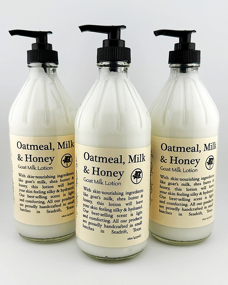 This seriously luxurious lotion contains goat's milk, honey and natural shea butter. Goat's milk is high in proteins, triglycerides, vitamins A, B6, B12 and E. All this and more go into making this lotion an excellent moisturizer. Honey is a natural antioxidant and anti-inflammatory agent. Natural shea butter aids in healing and skin regeneration. Your skill will thank you!