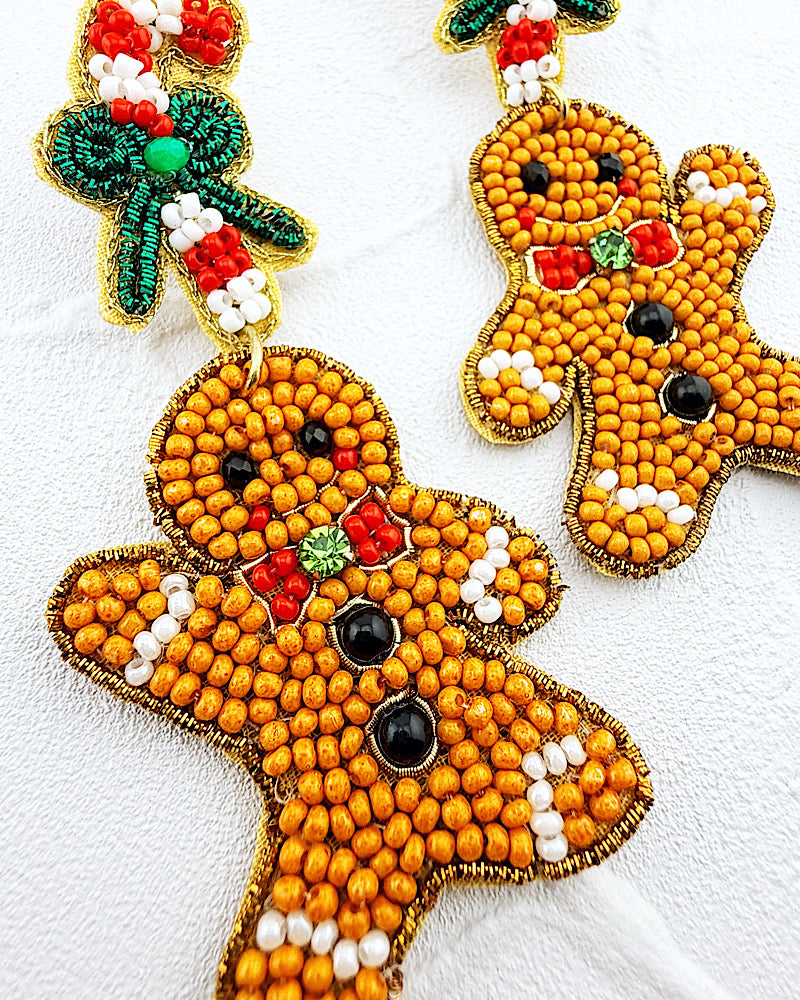 Hand beaded gingerbread men & candy can earrings. Large, statement size, lightweight, post style, 3"