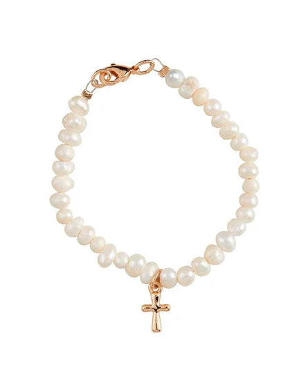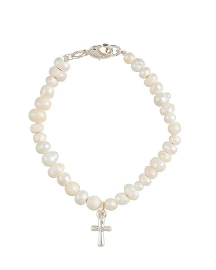 Pearl bead bracelet with petite metal cross charm. Lobster clasp closure. Comes in a cute little gift box.