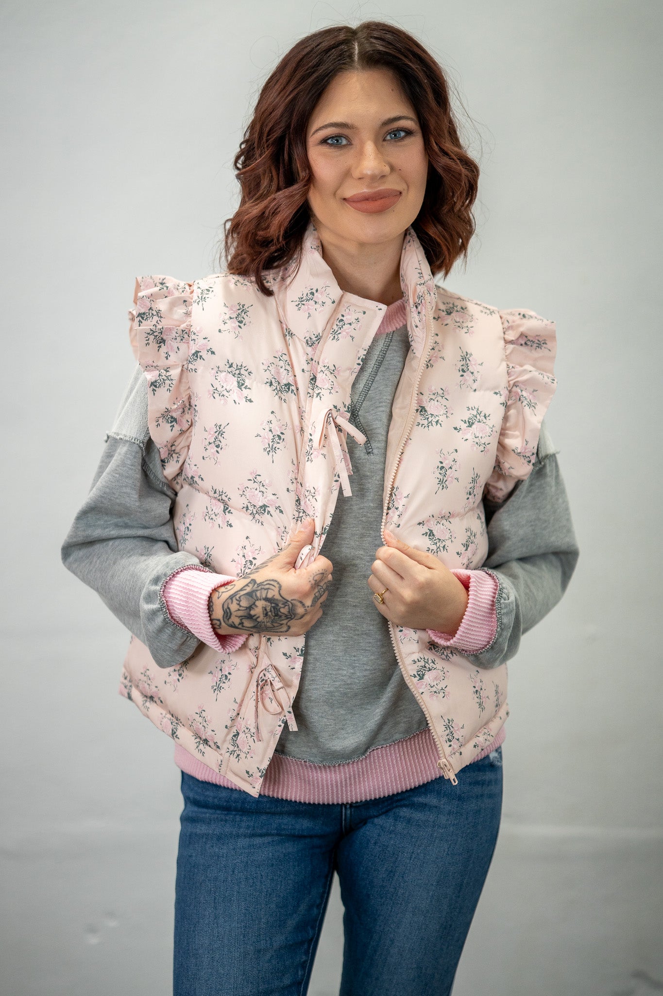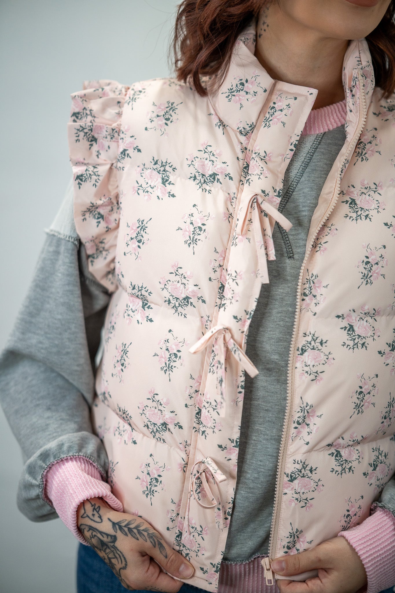 Add a touch of love and feminine charm to your outfit when you style this darling puff vest!