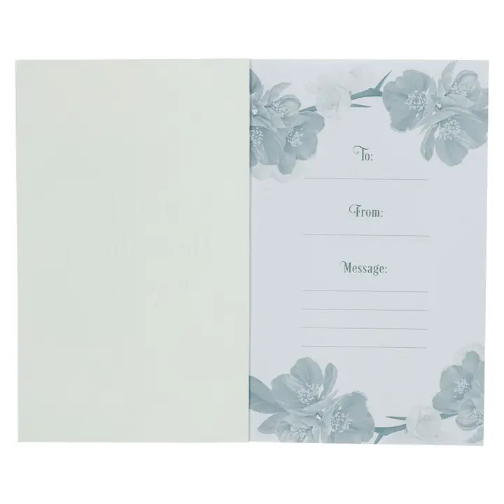 The devotional's pages are printed in teal and adorned with the same floral design as the cover. A presentation page at the front allows for personalization when it is given as a gift. The content is organized by calendar month, each introduced by a beautiful floral page and a stylized Bible verse.
