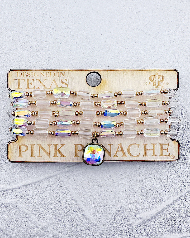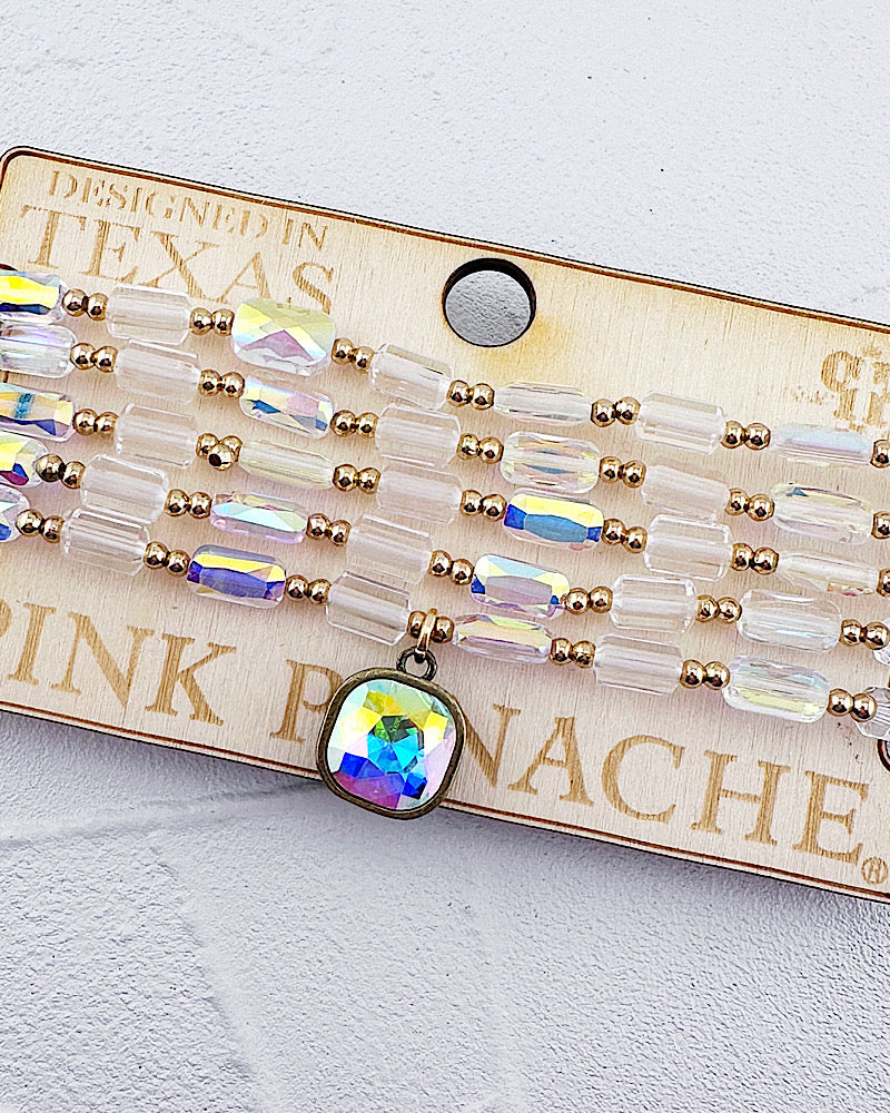 You'll be wearing the Portia stack with everything! Featuring 5 dainty iridescent & gold bead bracelets with an iridescent, fiery swarovski crystal charm. All are stretchy!