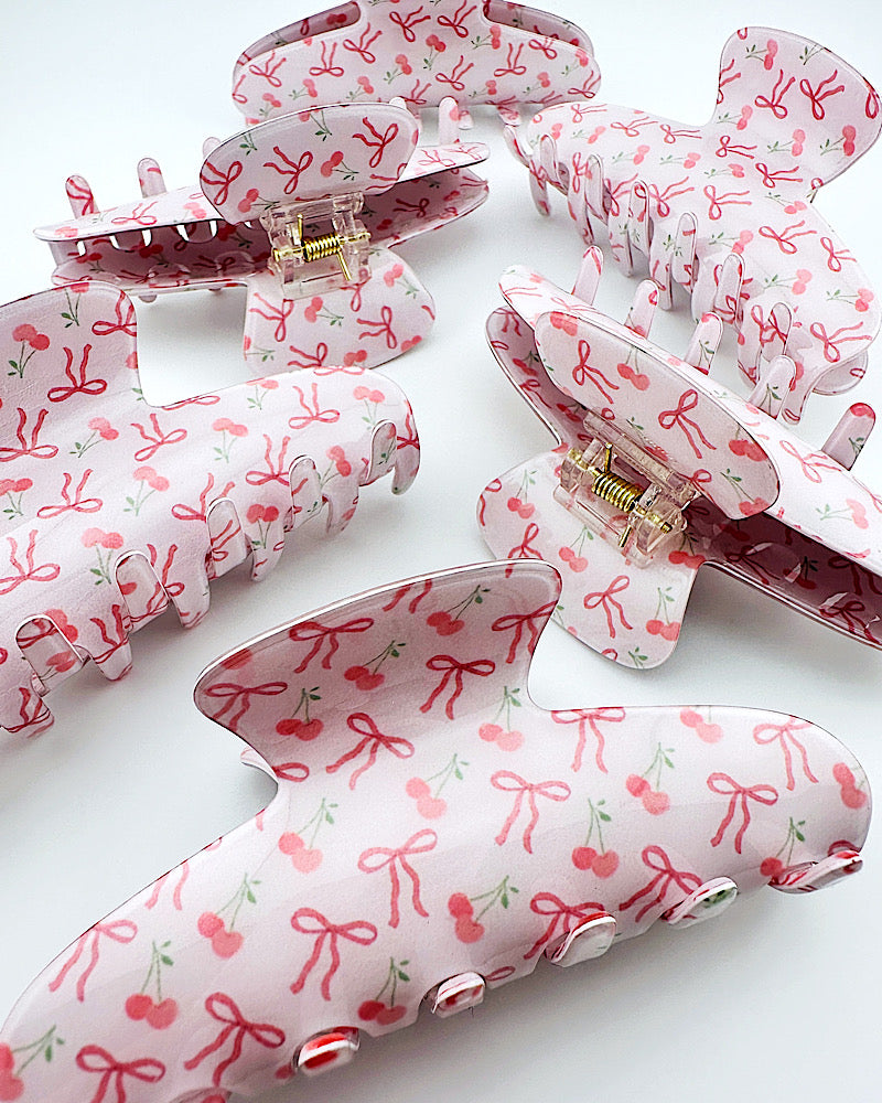 The sweetest pink hair clip. The perfect "anything but basic" claw clip....pale pink with coquette bows & cherries. Make putting your hair up effortless. Lightweight acrylic claw clip, 4-1/4"