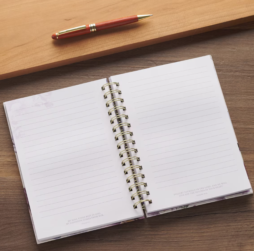 The journal has 192 pages. Each page is lined and features a Scripture verse at the bottom. These verses can be used as Scripture memory verses, journals, or prayer prompts. There is a presentation page where you can add a message when you decide to give this journal as a gift. The journal is bound in durable gold o-wire.