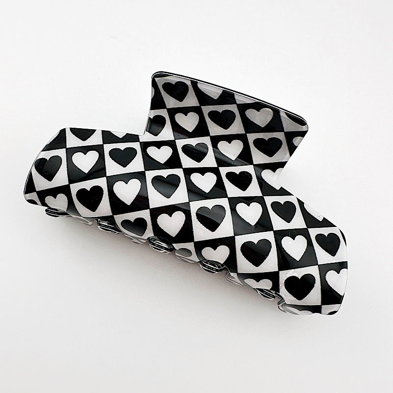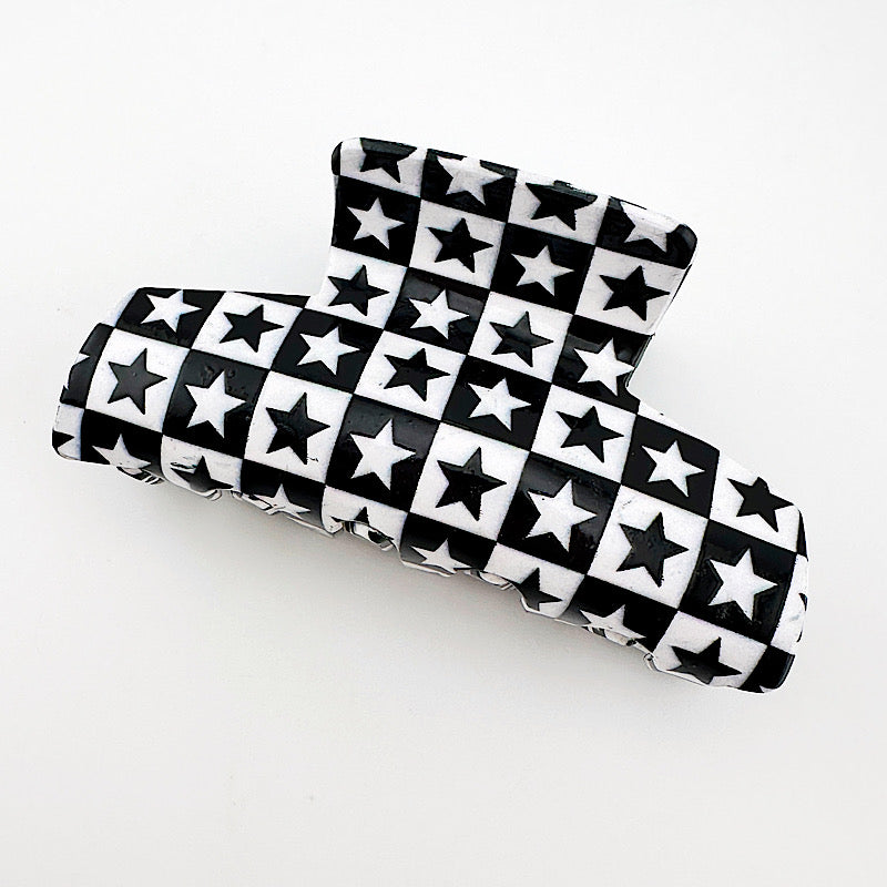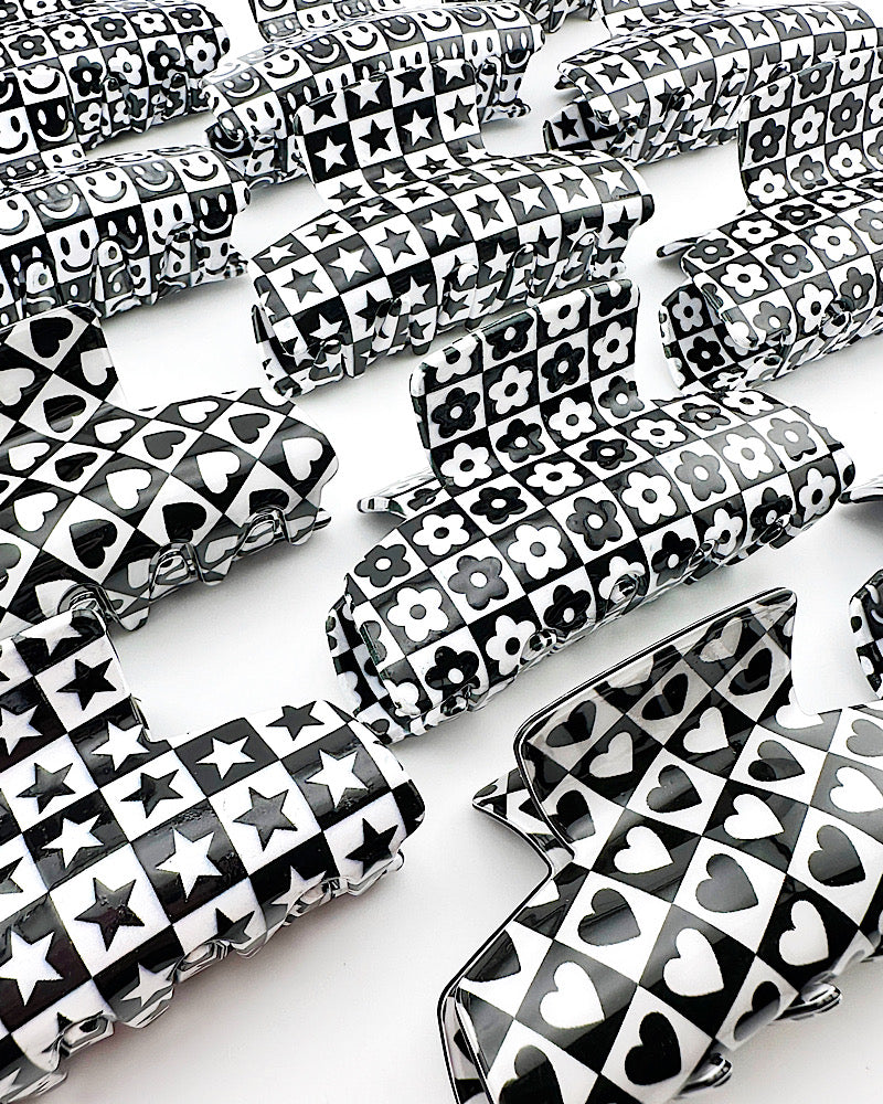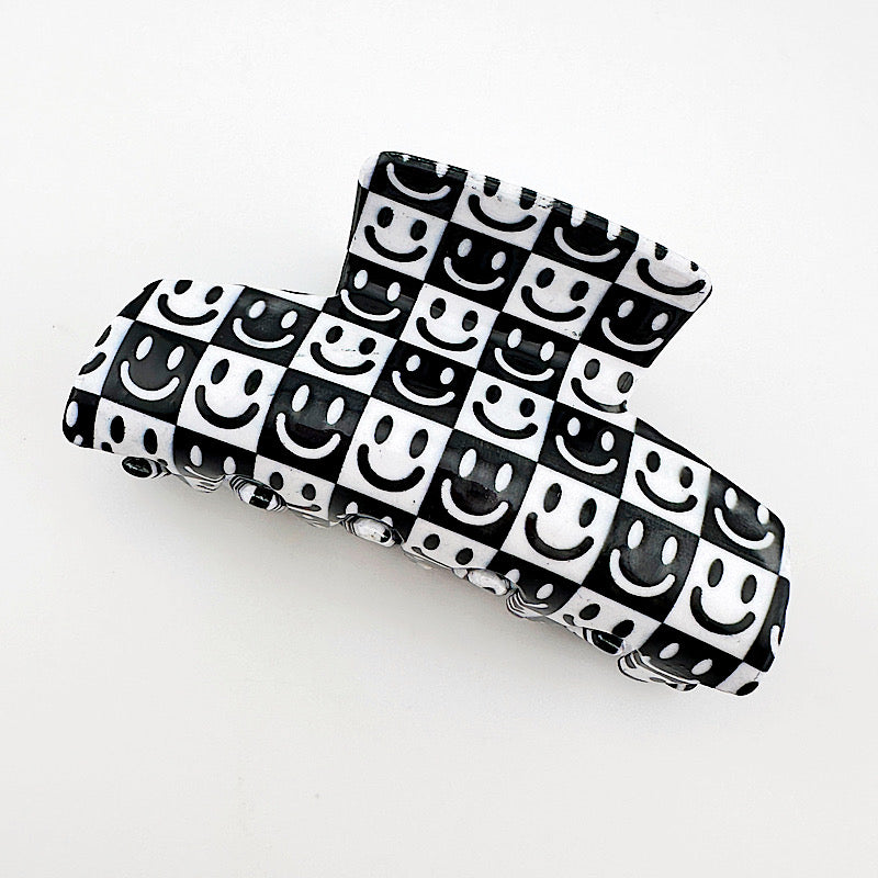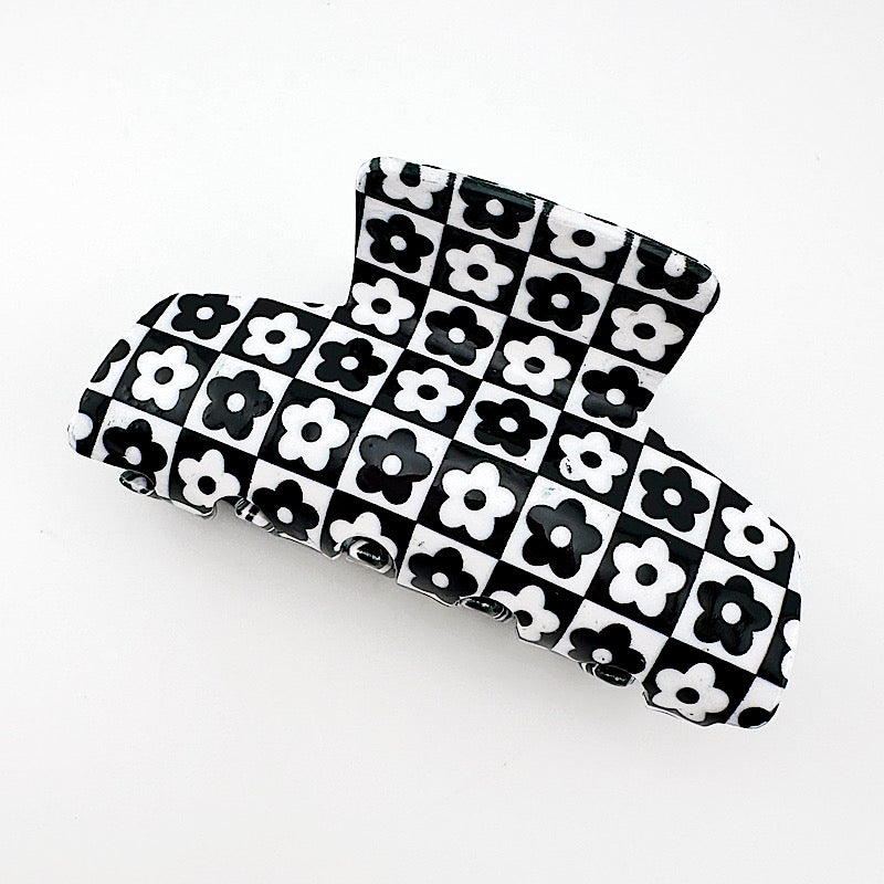 Black & white checker but make it fun & funky! Lightweight claw clip in 4 fun prints. 3-3/8"