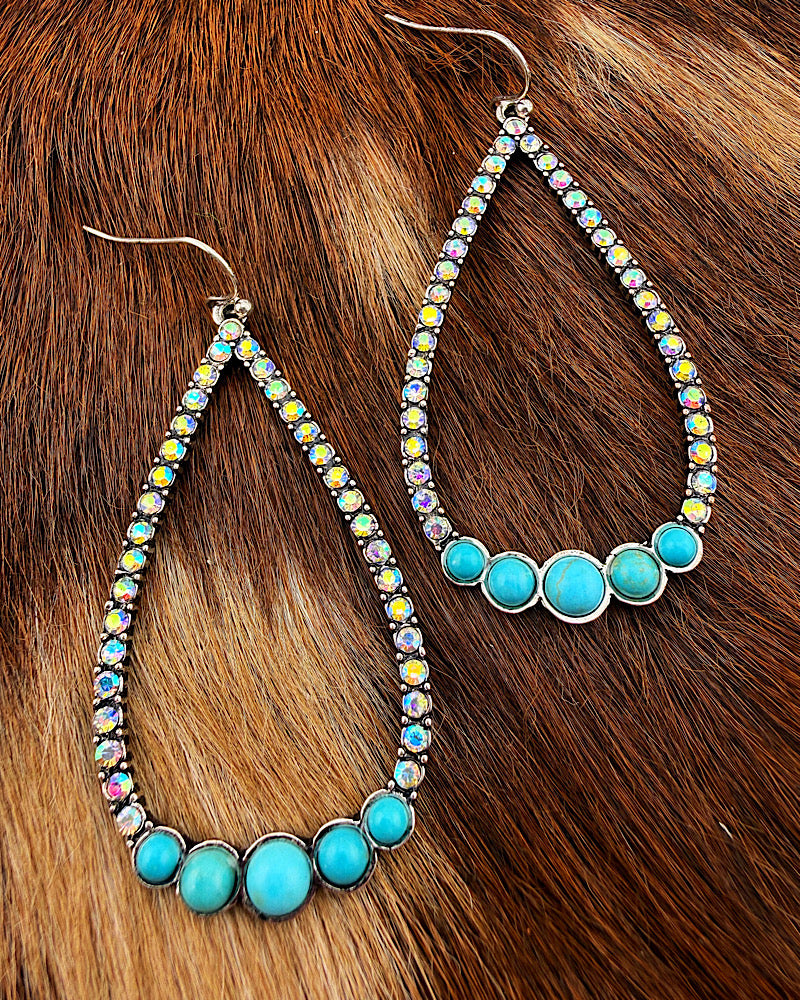 All the best features in one pair of earrings....turquoise & bling! Lightweight teardrops with a worn silver finish, iridescent crystals & turquoise stones. French wire style, 2-1/2" drop.