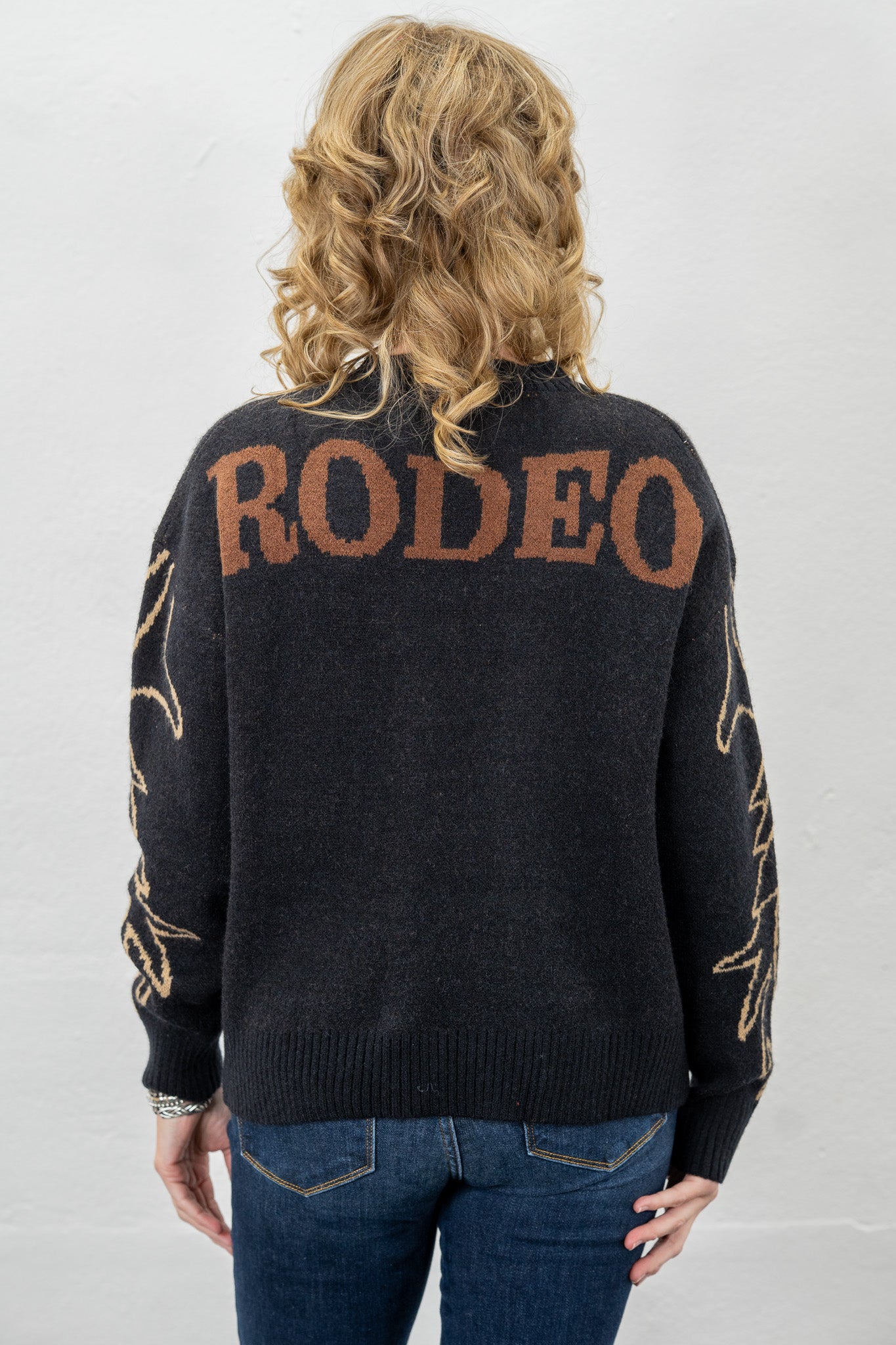 You'll look warm and effortless in our Round 'Em Up Sweater with it's rodeo flair!