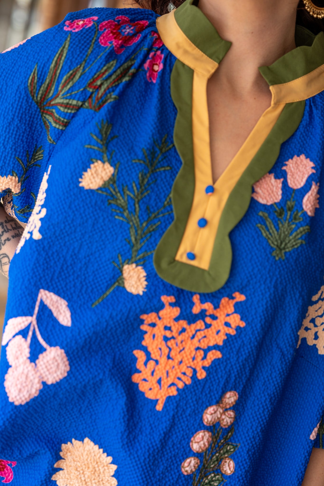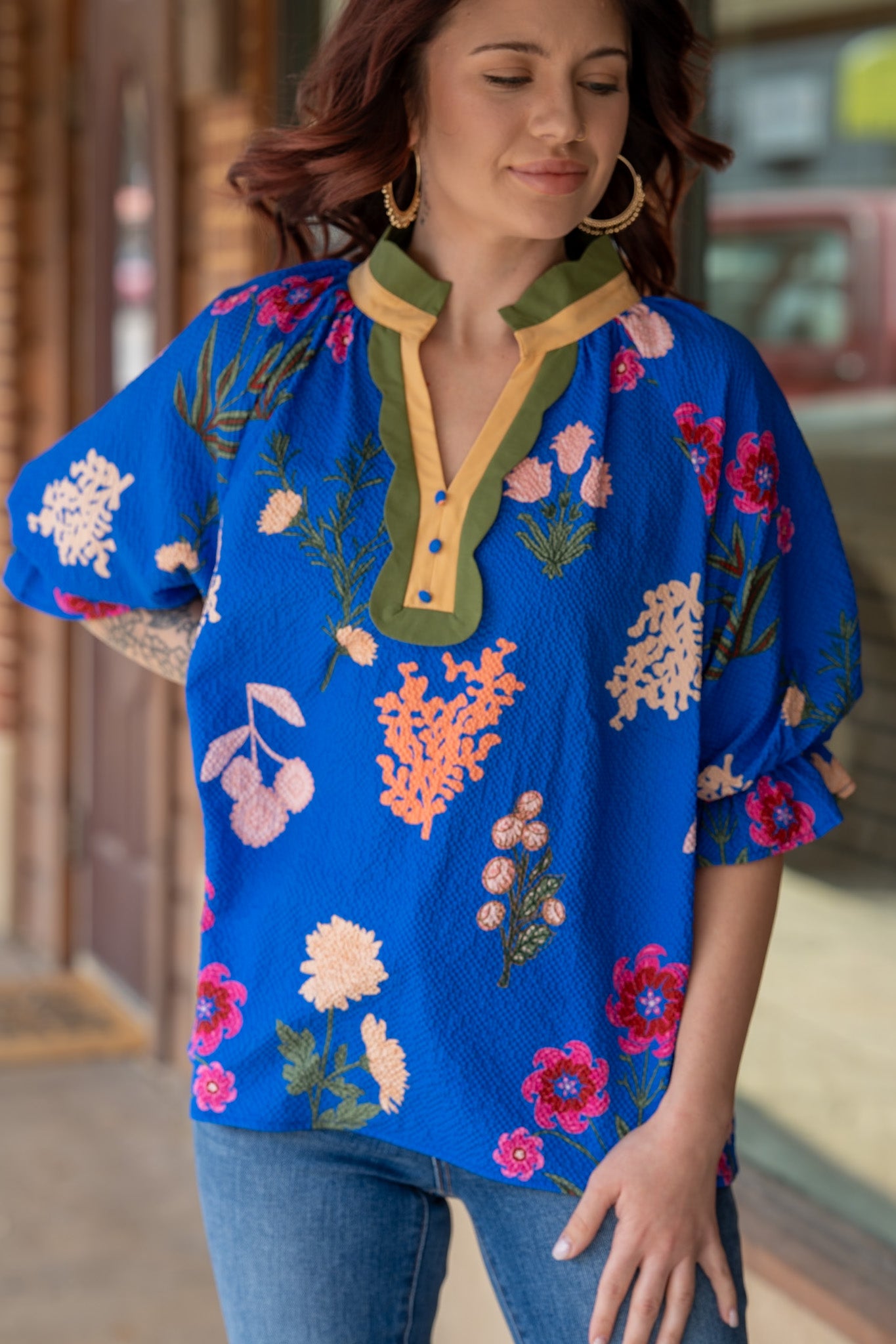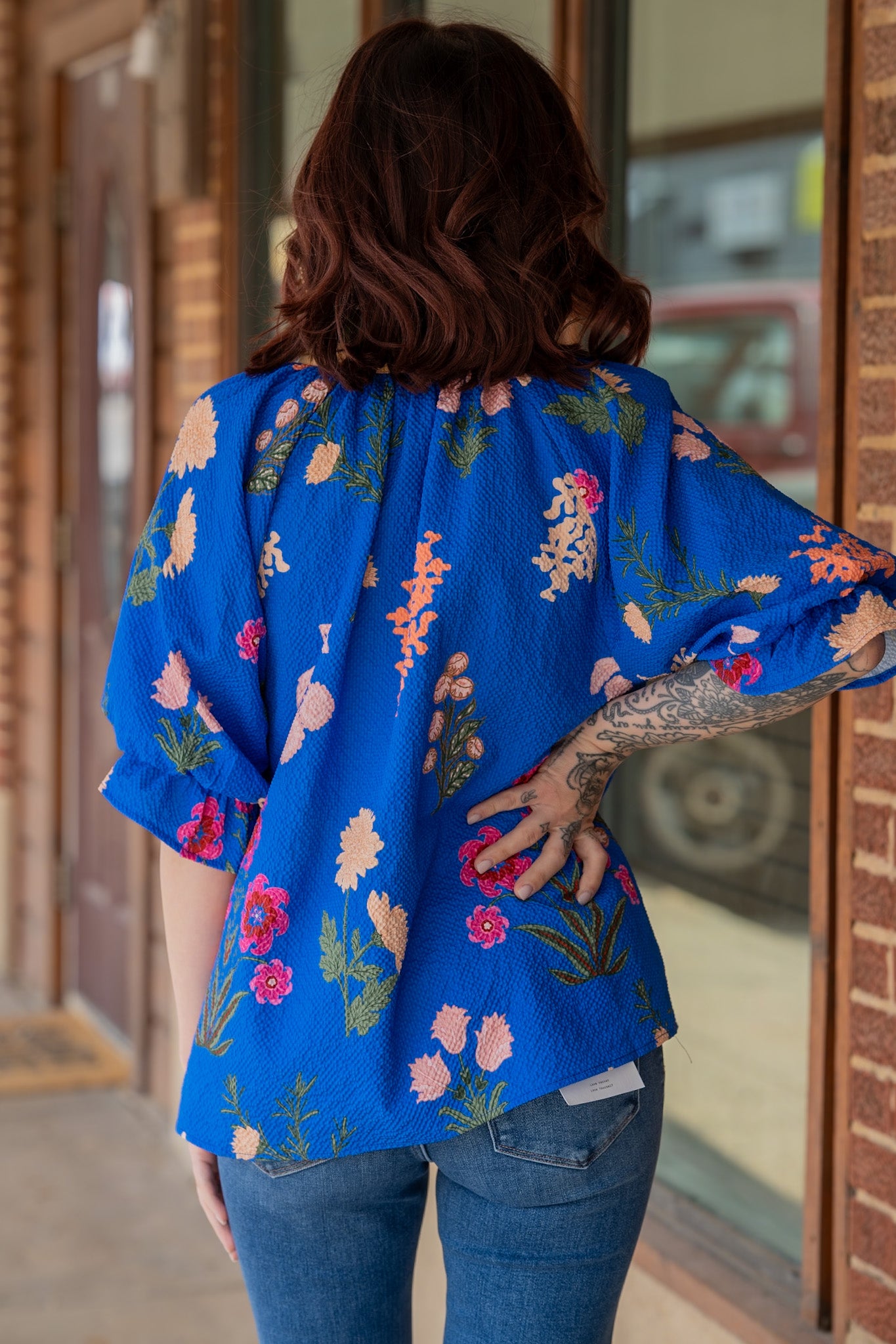 This top is a vibrant celebration of color and feminine charm! Crafted from a striking royal blue, this top features pops of lively florals and textured fabric.