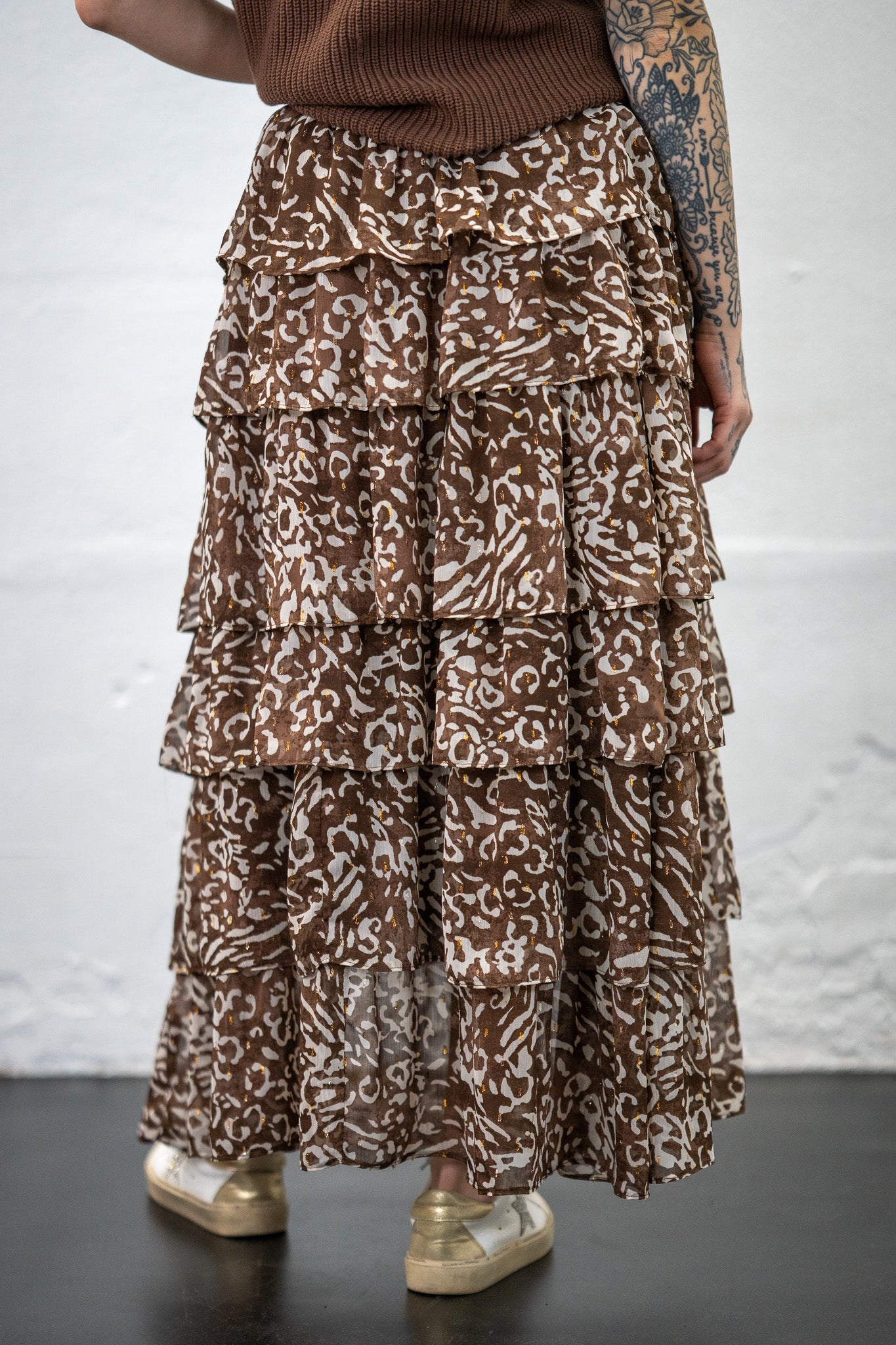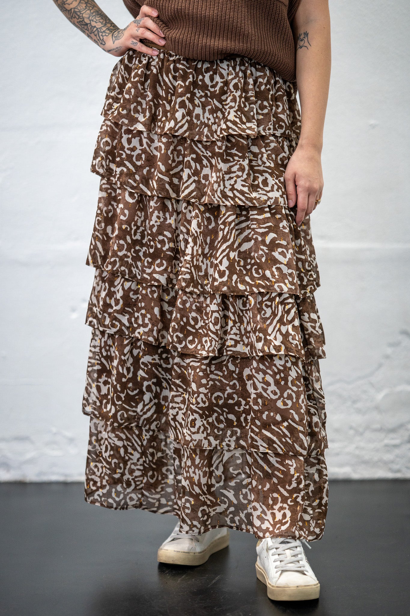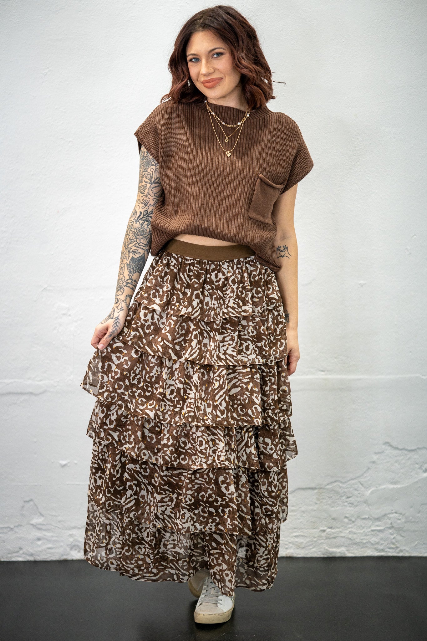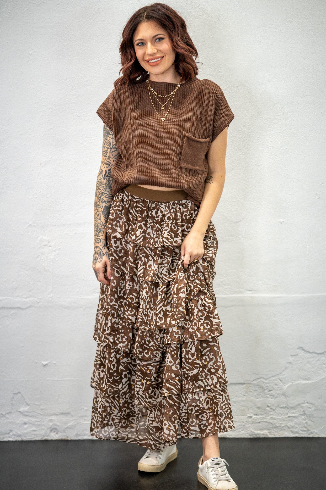 Get ready to Ruffle some Feathers when you wear this darling skirt. Leopard print with subtle touches of gold. Perfect for the rodeo, church, date night.... honestly, we could go on and on!!