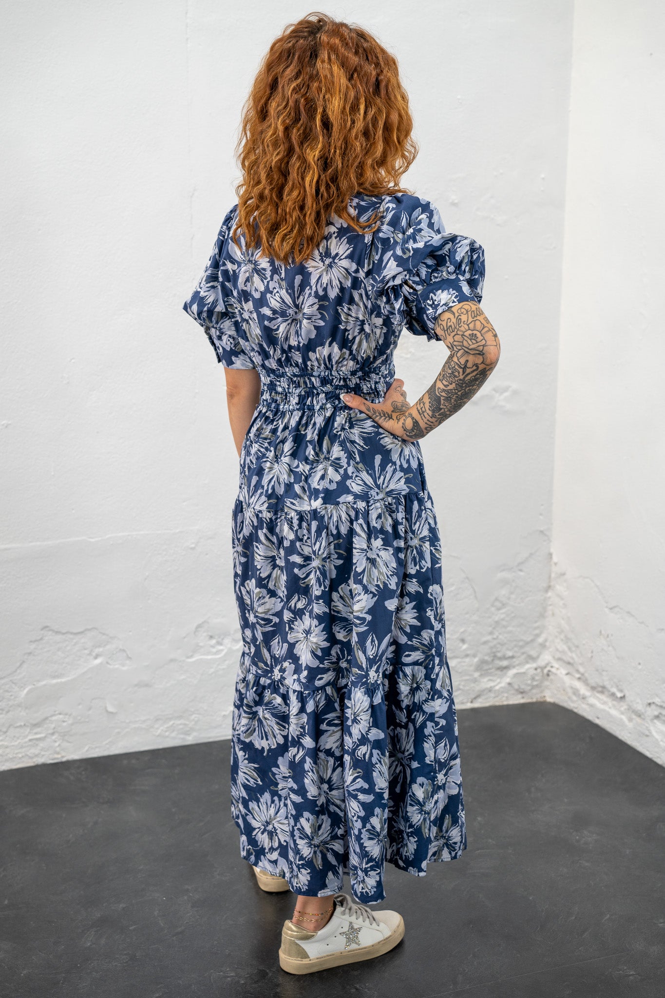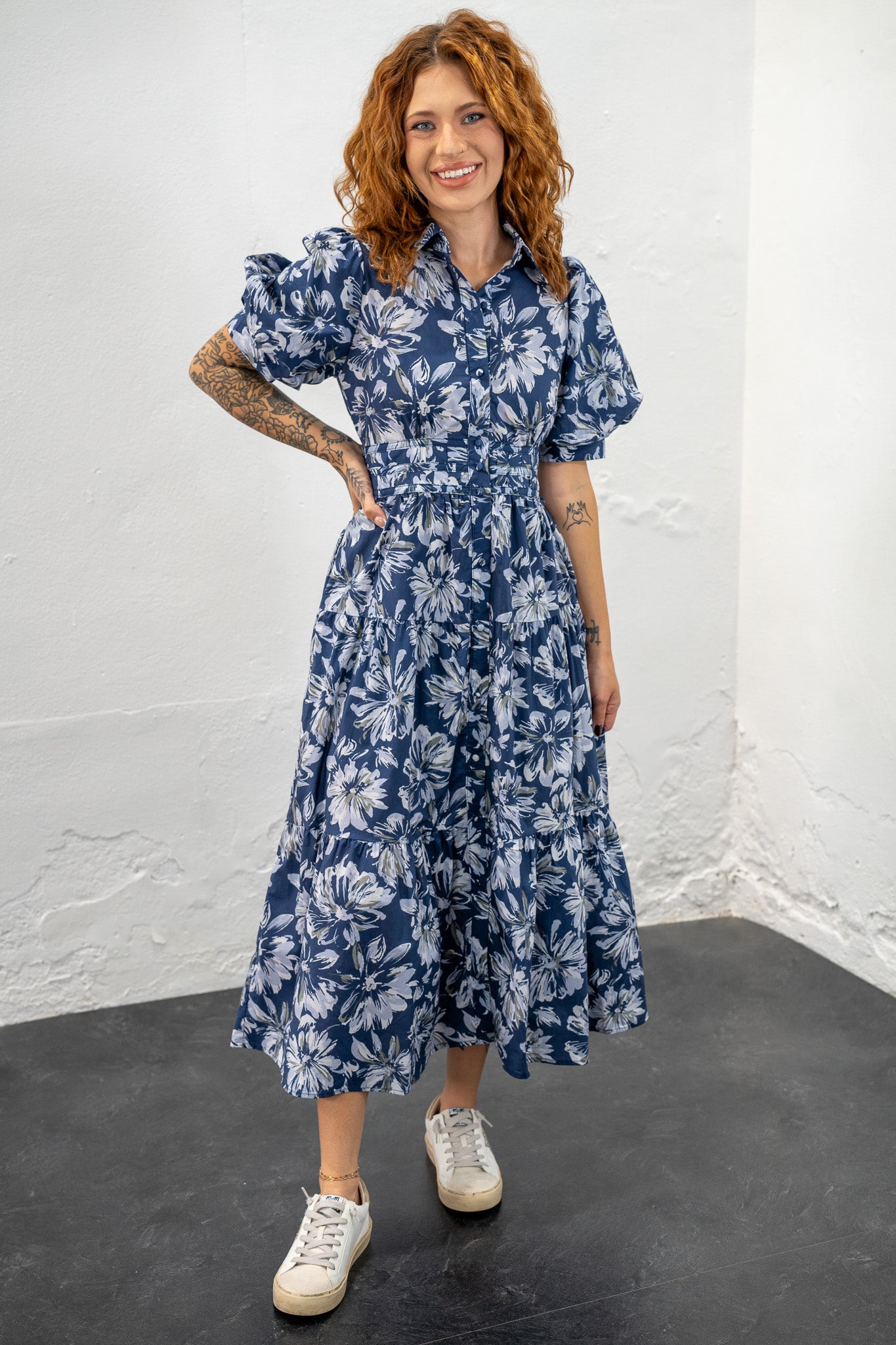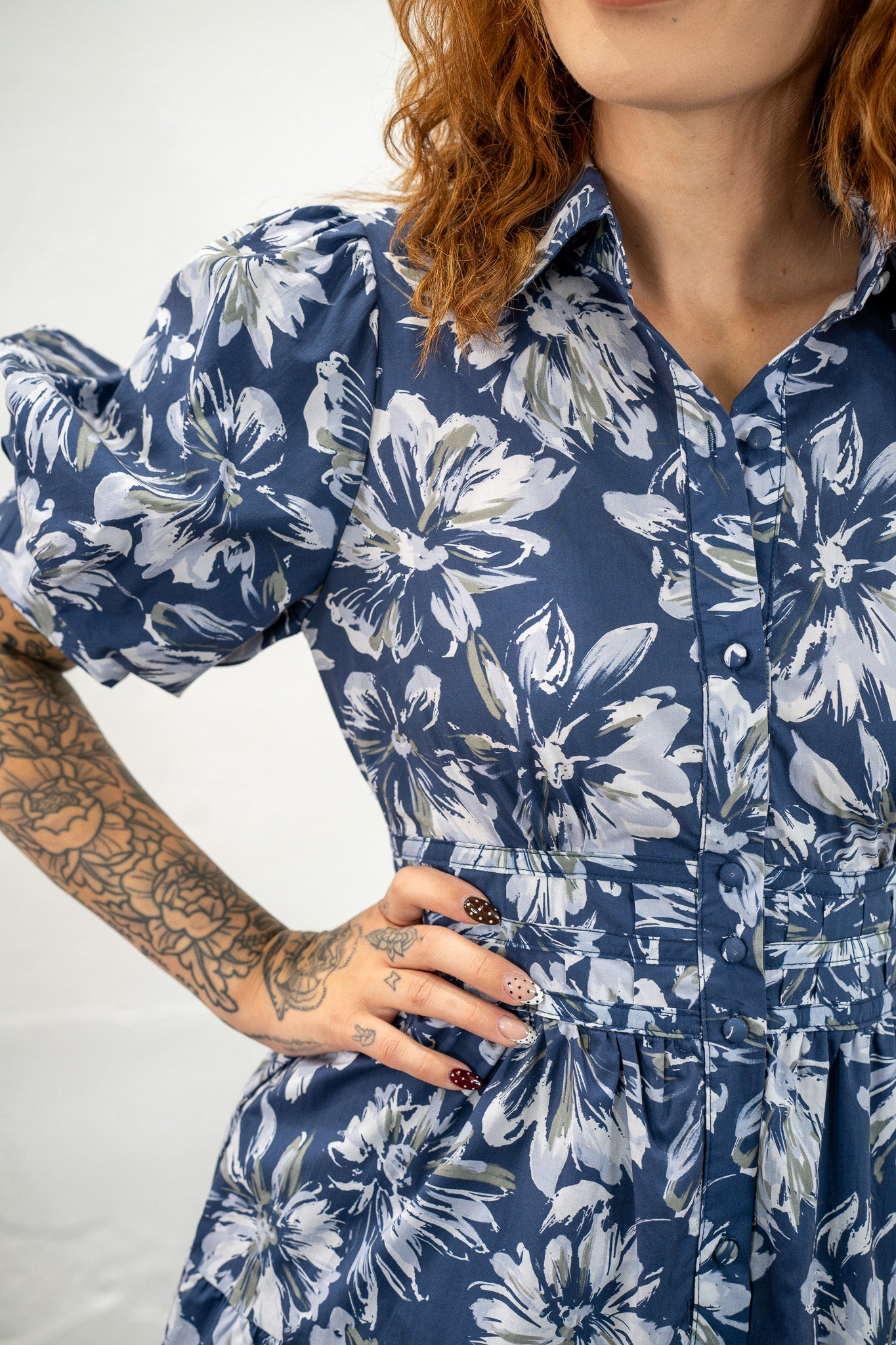 Triple-banded waist, button-up front, collared neckline and puff sleeves.