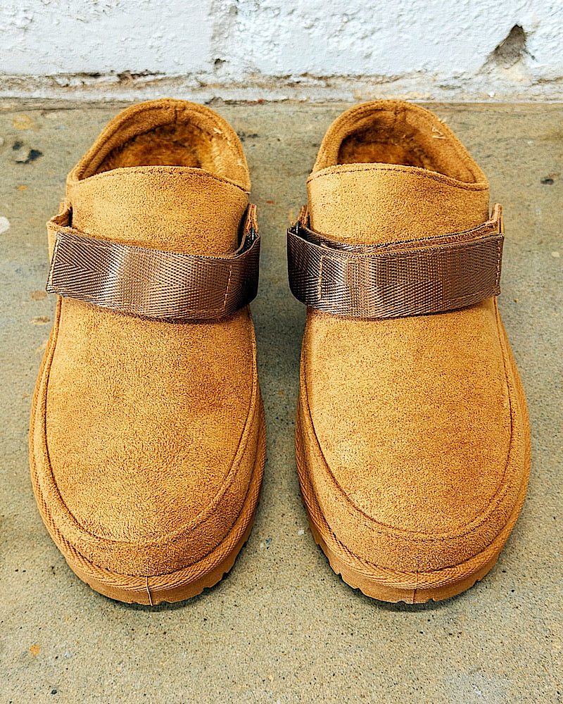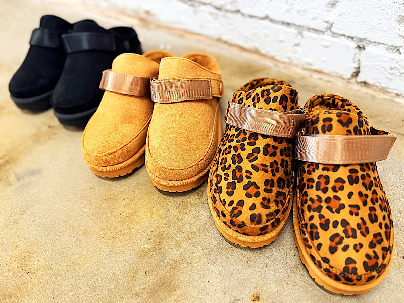 Your new go-to for chic comfort all day! Blending the ease of a mule with modern flair. These semi-platform mules feature a stylish buckled strap with functionality. Wear it as a mule or flip the strap back. Velcro strap for the perfect fit. Also available in black & leopard! Whole sizes, if you're in between size up. Comfy fuzzy interior.