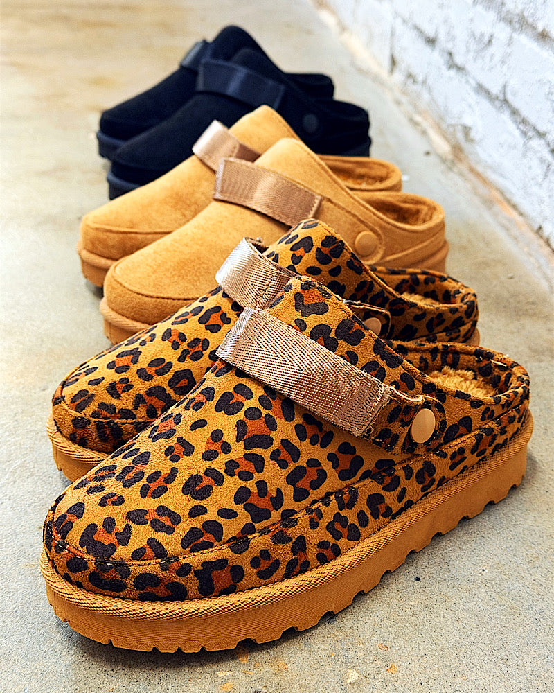Your new go-to for chic comfort all day! Blending the ease of a mule with modern flair. These semi-platform mules feature a stylish buckled strap with functionality. Wear it as a mule or flip the strap back. Velcro strap for the perfect fit. Also available in black & camel! Whole sizes, if you're in between size up. Comfy fuzzy interior.