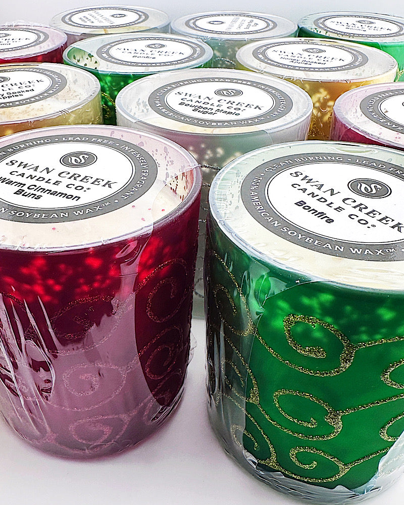 Our favorite candles now in holiday glass jars. These make great gifts. Shimmery finish with glittery swirls.