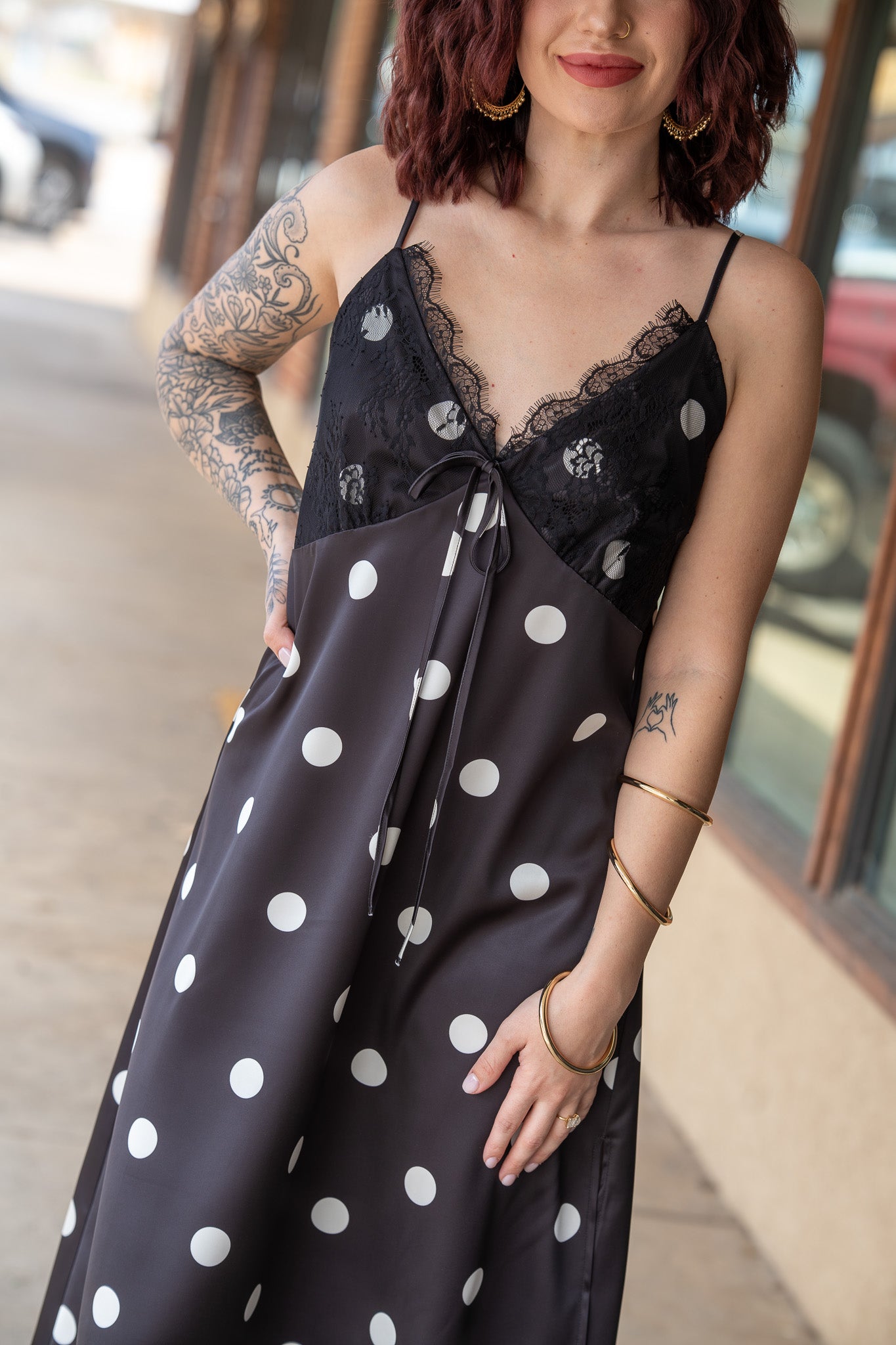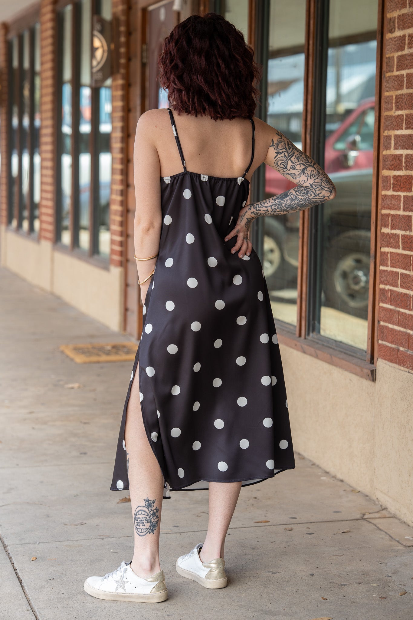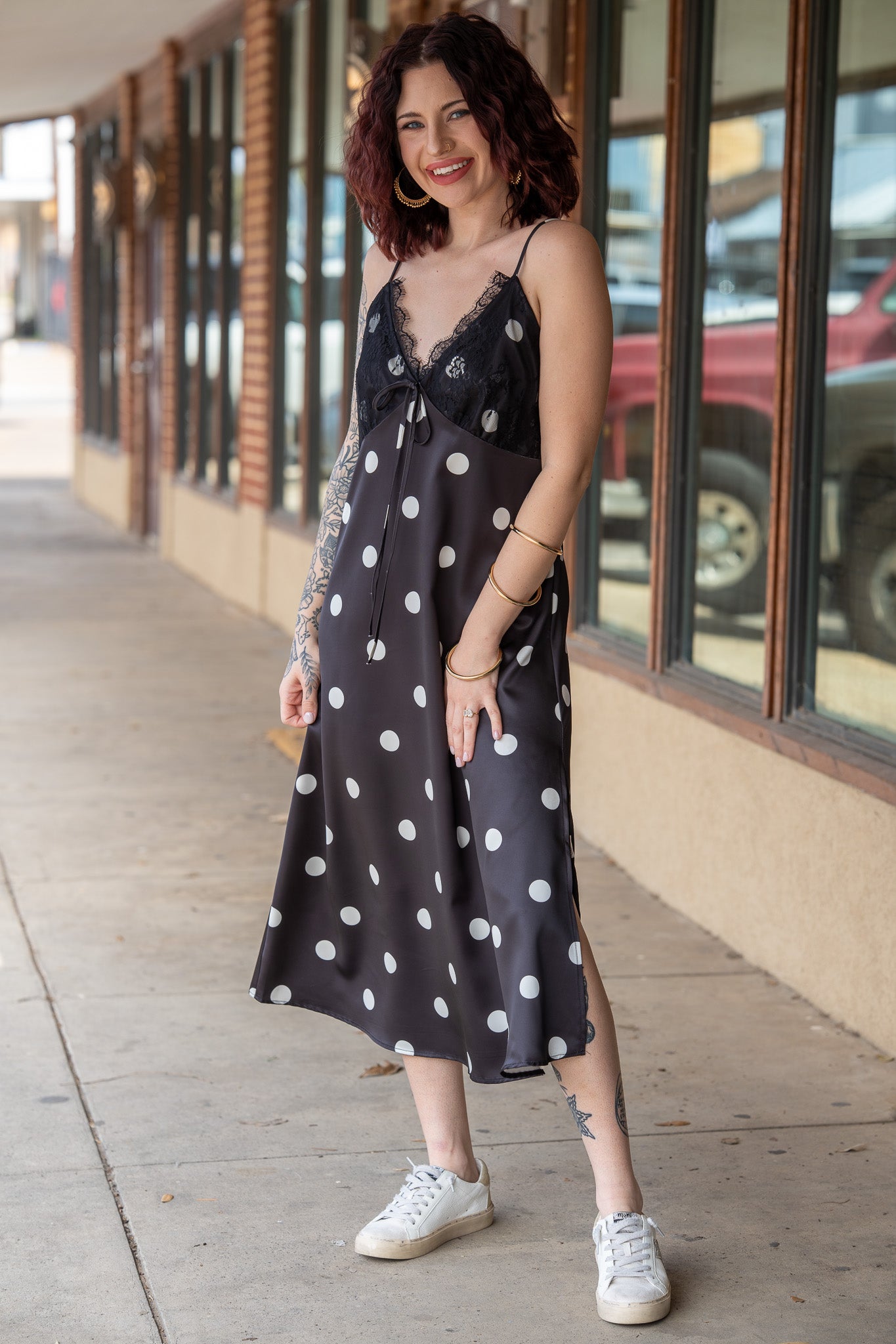 A timeless classic with a sultry twist, this slip-style midi dress features a sleek, body-skimming silhouette adorned with playful polka dots for the perfect balance of sweet and sexy!
