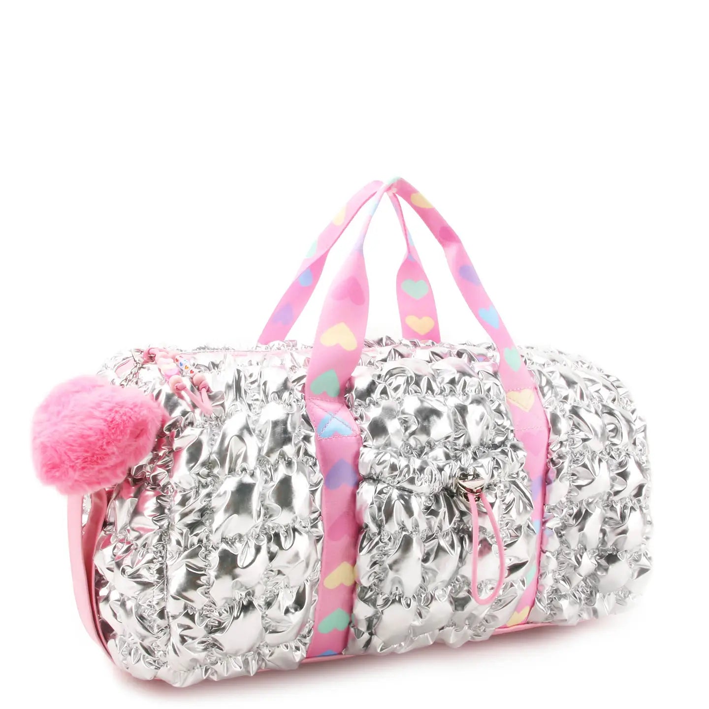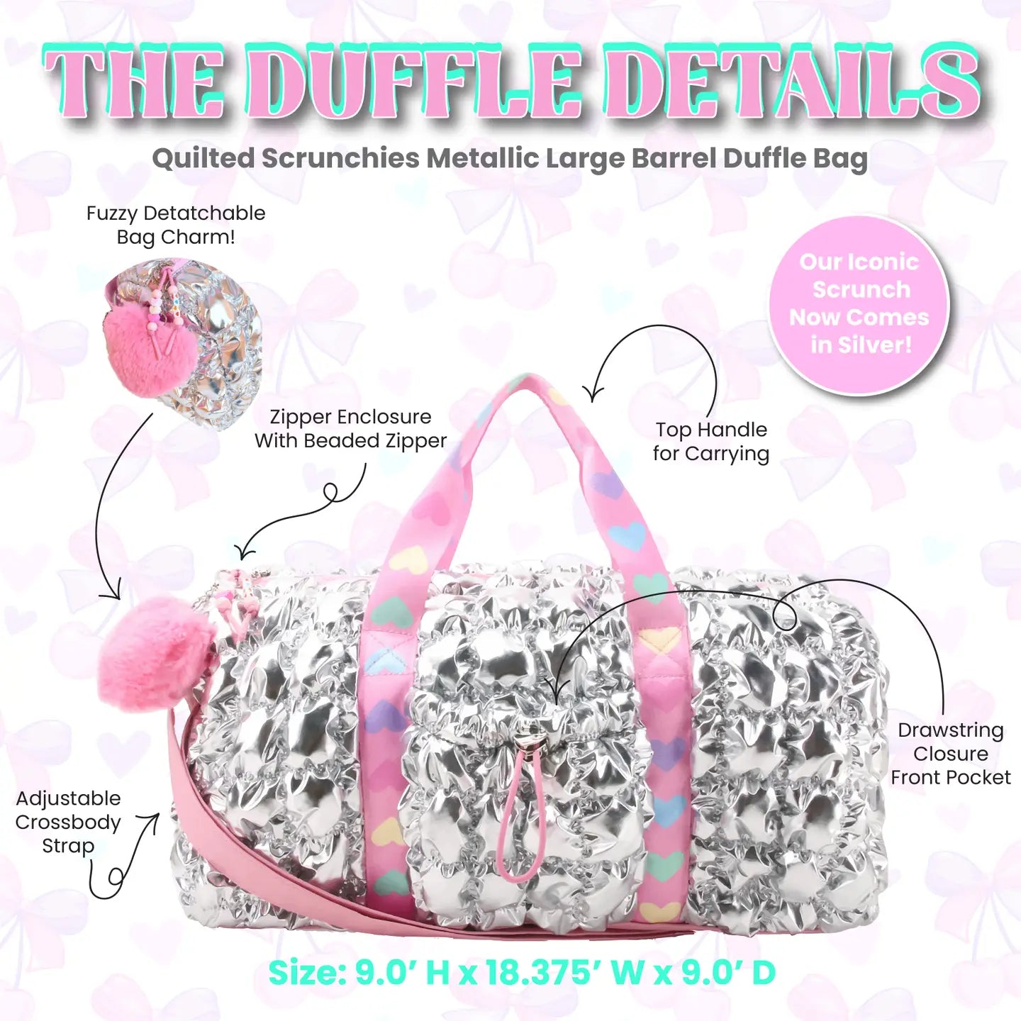 Our nylon quilted scrunch large duffle bag just got a super posh upgrade! Featuring a plush heart zipper pull & heart printed straps, our new nylon quilted silver metallic large duffle will become their new go-to bag! From their extra curriculars, to the gym, dance class, weekend getaways, and everywhere else in between!