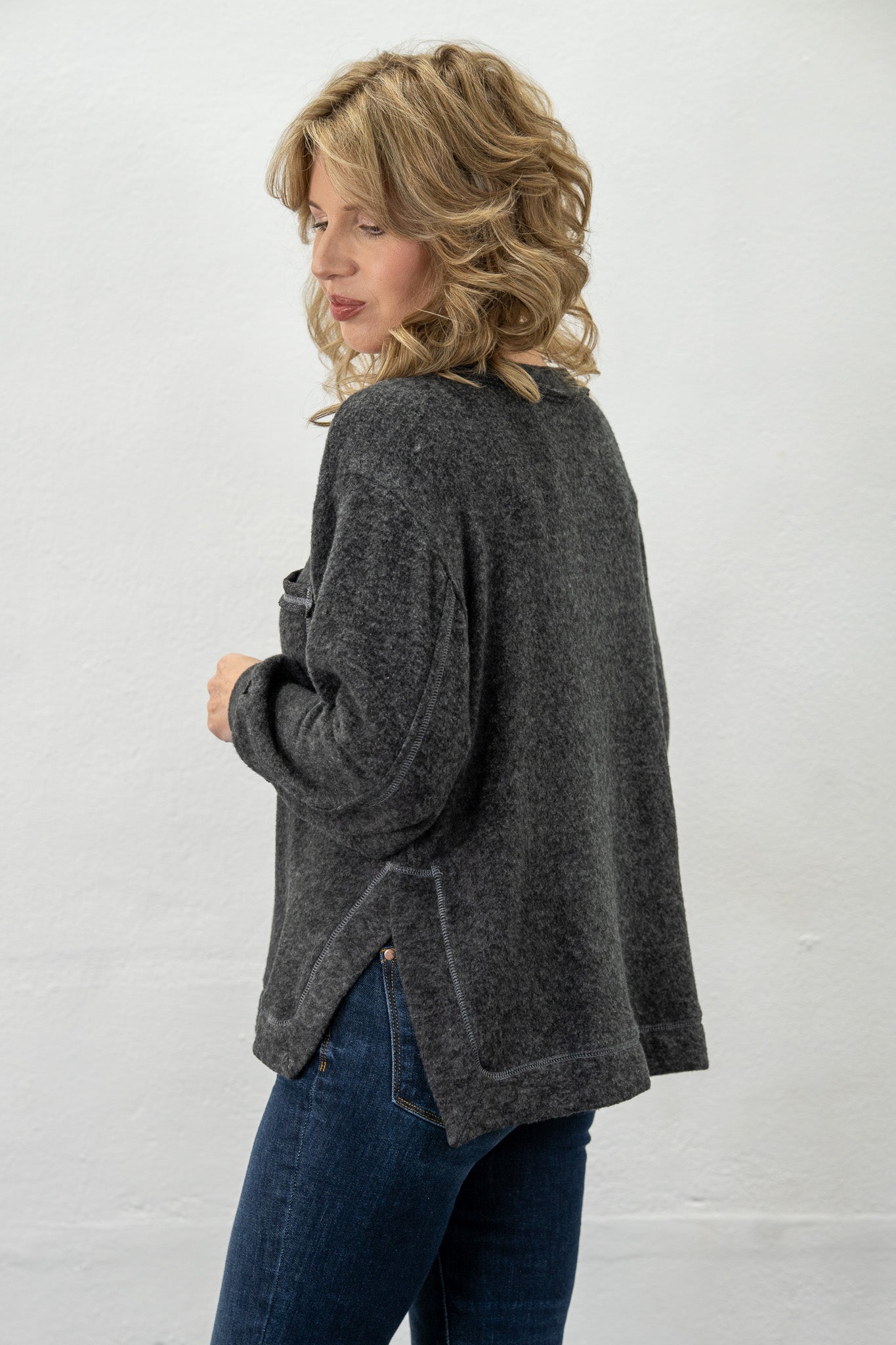 The cut of these are so fun and unique. Hi-low hem with dramatic side slits and front pocket detail.