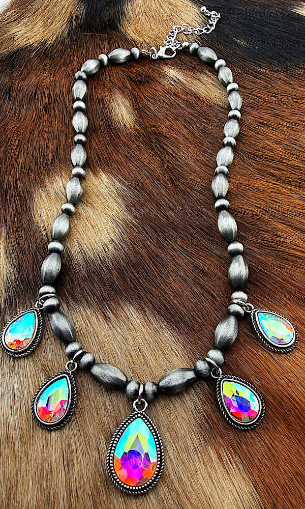 The Somerton necklace is a great way to add some sparkle to your outfit. Lightweight pewter navajo pearls & iridescent jewels make this a standout piece. Adjustable from 16-19"