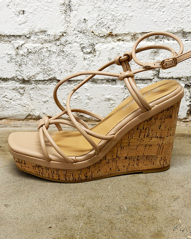 Step into stylish comfort with Stacia. These sandals feature a cork platform wedge & nude knotted straps with an adjustable buckle closure. Wear them with all of your favorite spring & summer looks. 4-1/2" heel height.. 1-1/2" front height.