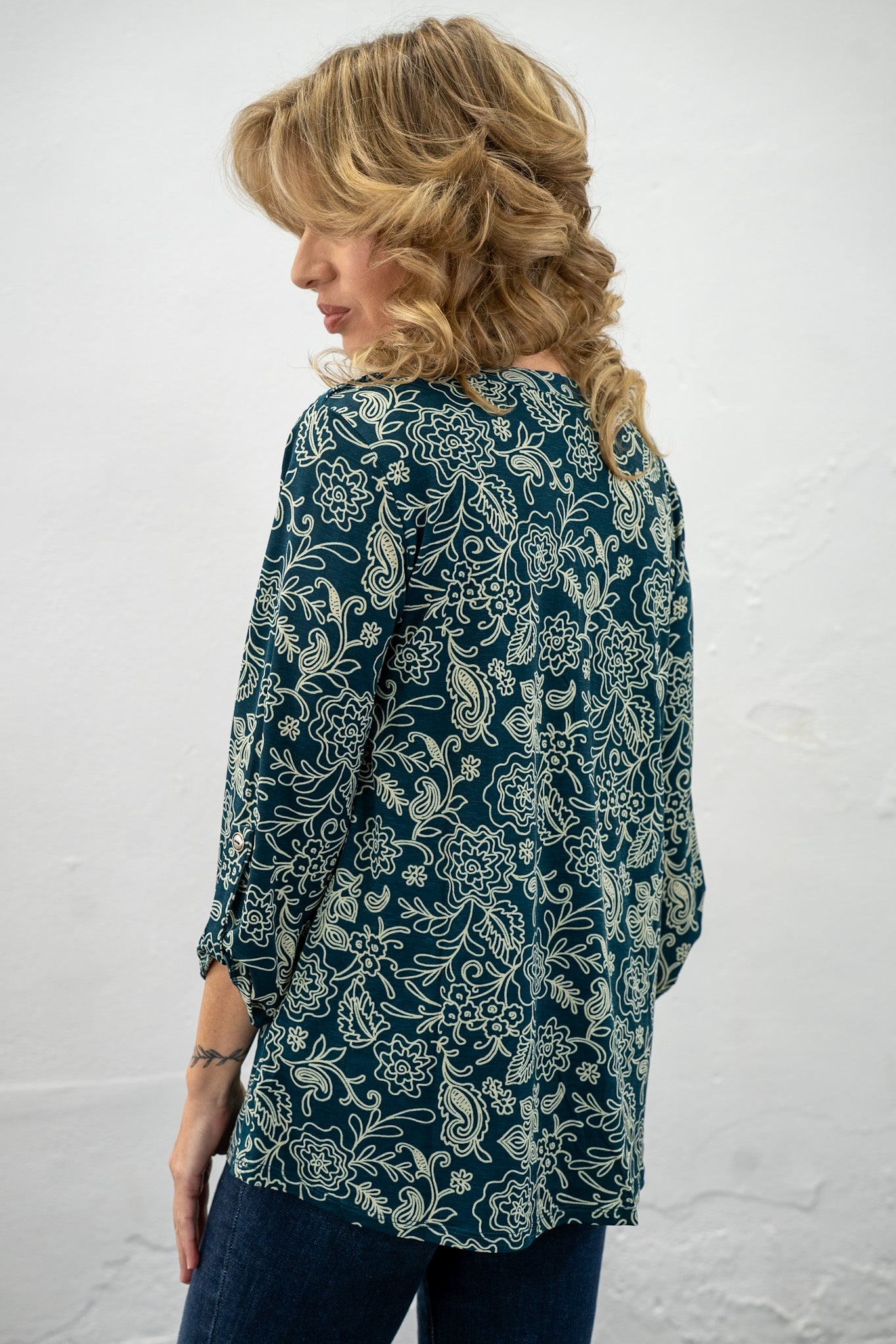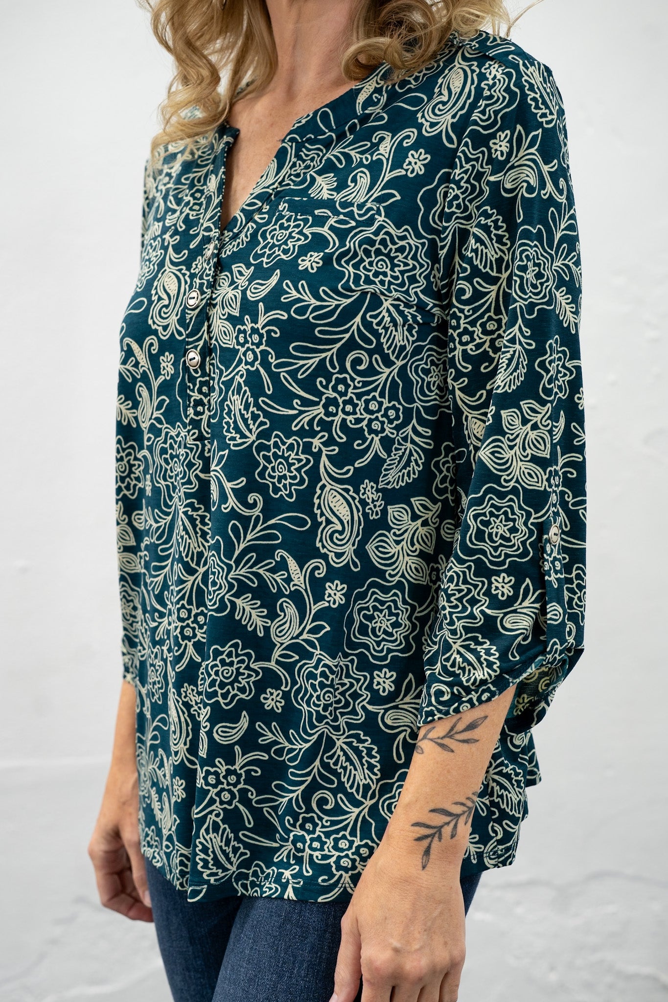Wrinkle resistant fabric is back and cuter than ever!!! A beautiful deep teal green hue with cream colored floral designs all over! Perfect for work, church and anytime you need to be effortlessly styled!