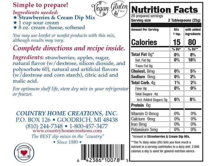 Strawberries & Cream Dip Mix is a much-loved classic as a creamy dip! It’s the taste that will take you back to the good old days when Grandma would whip you up a delicious bowl of ripe red strawberries glazed with sweetened cream and sugar. Great with any fruit or cookie, or use it to make a scrumptious pretzel delight or poke cake.