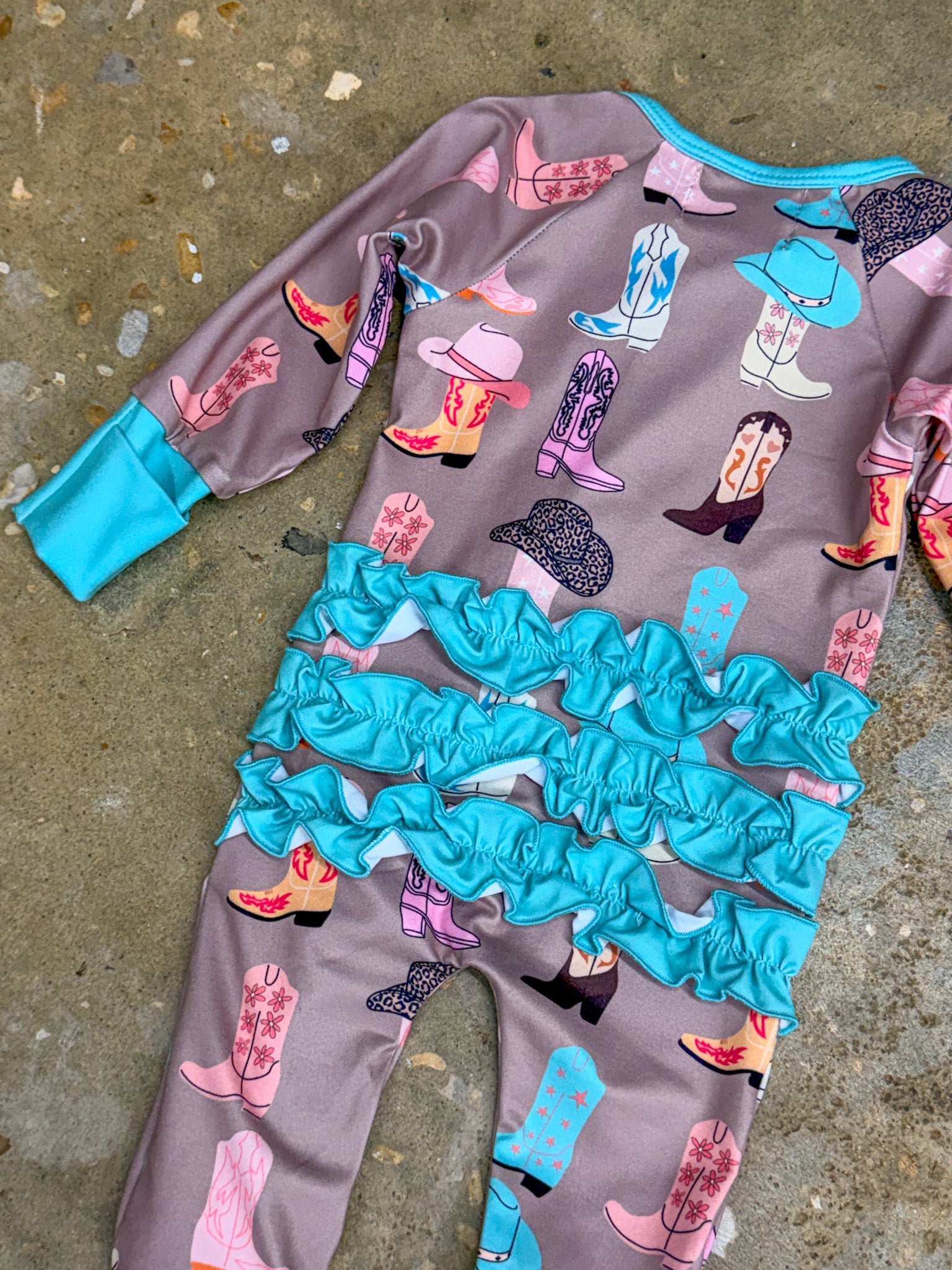 Ruffles, colorful cowgirl boots and soft comfy fabric...show us a better combo! Keep those babies comfy, in style and warm with this darling sleeper!