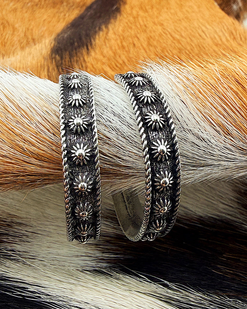 The Sundown hoops have an edge to them. Worn silver finish, concho & rope details. Post style, 1-3/8"