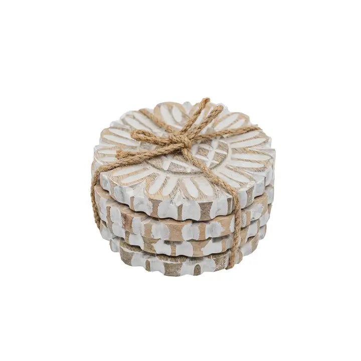Add charm to the table with our Emery Hand Carved Whitewash Wood Floral Coasters. Featuring hand carved floral details with a whitewash finish. Perfect as small gifts or decorative accents.