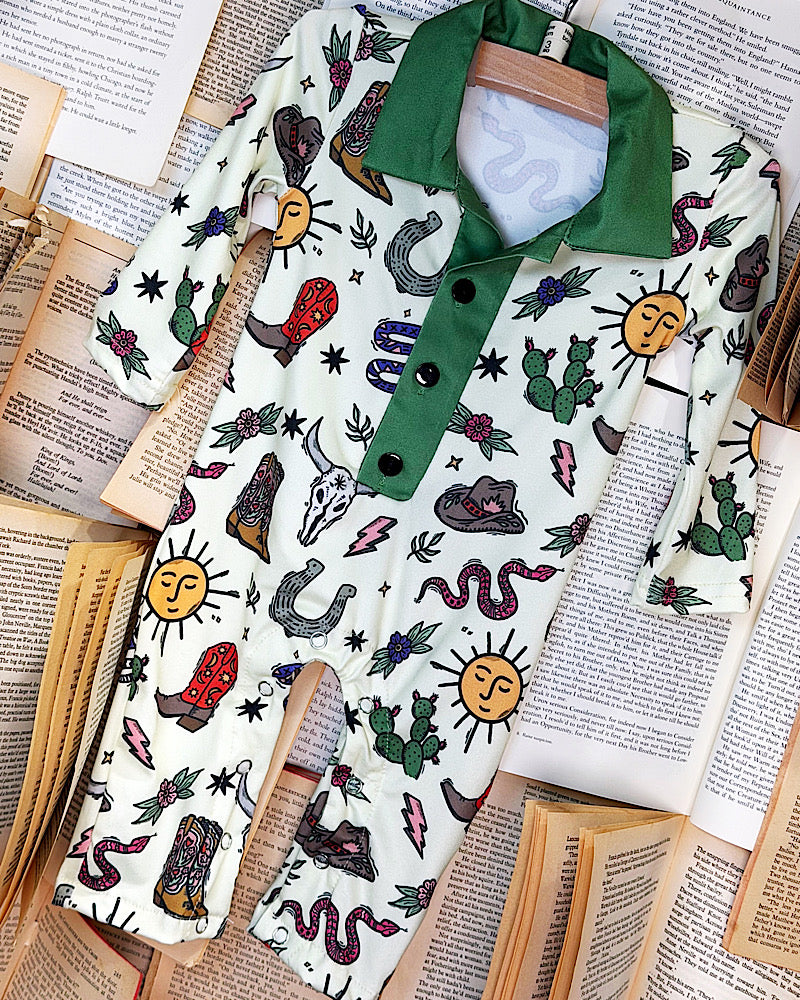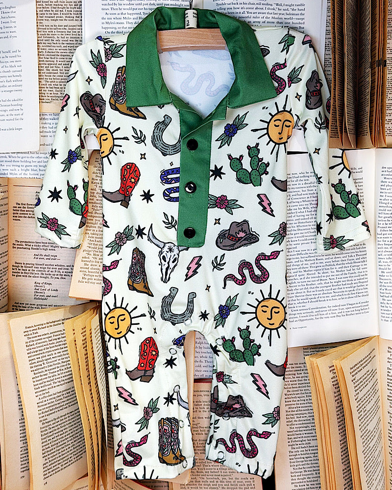 Welcome to the wild west - kid style! The Sunset Riders Collection is full of charming western flair, featuring friendly cow heads, cactuses, boot, and other classic frontier friends! Designed with the little explorer in mind, these pieces are made for everyday wear, for both boys and girls alike!!