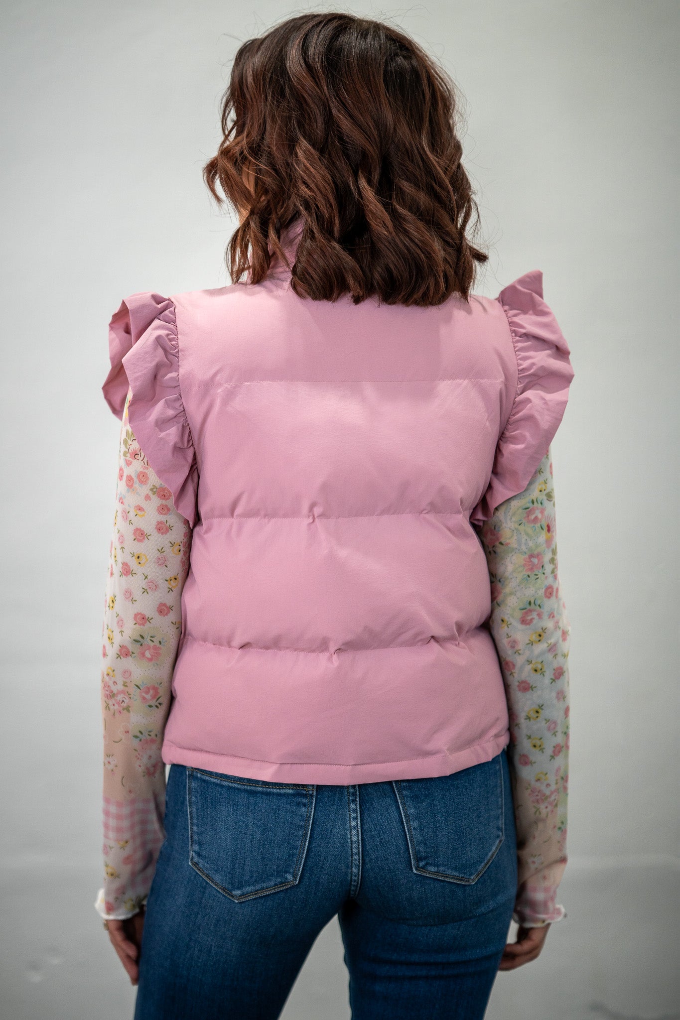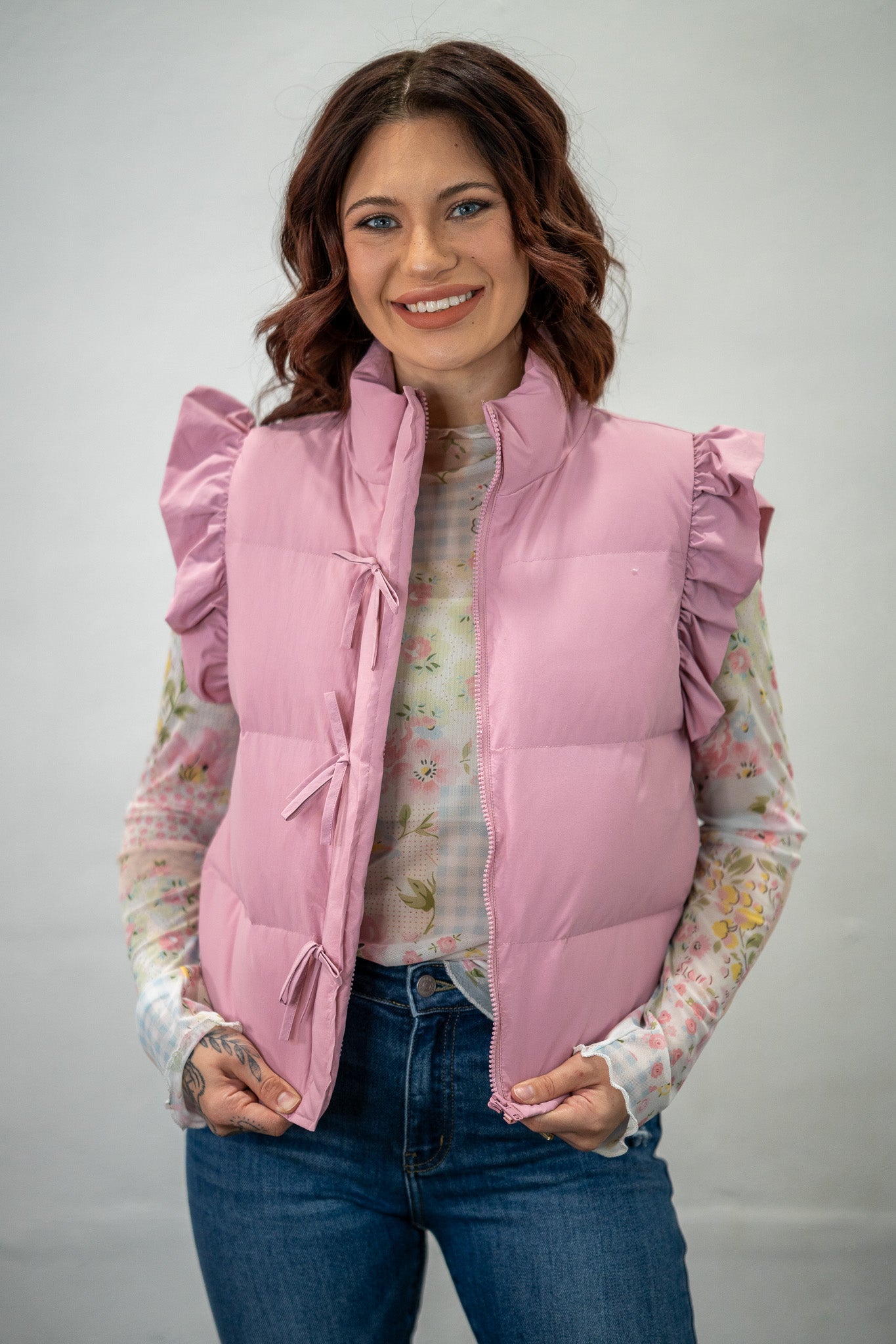 Our Sweet Ruffle Puff Vest is the missing piece to your wardrobe! Soft and oh, so comfy!, made from a beautiful mauve pink fabric with darling ruffle and bow details.