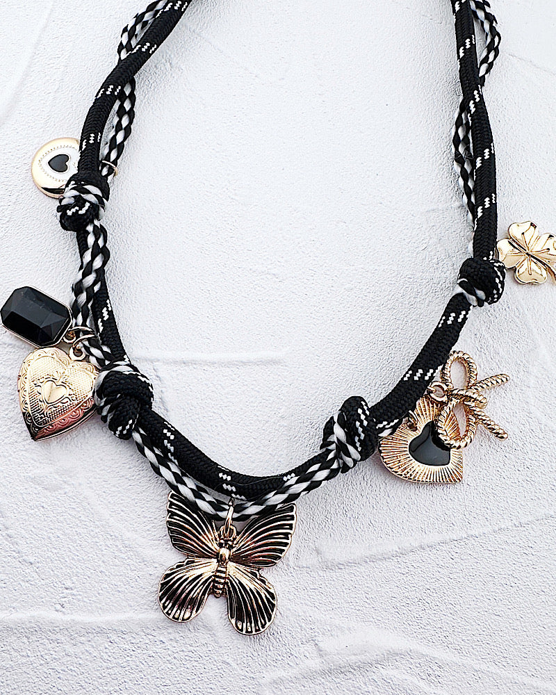 A charm necklace but make it unique! Double black & white corded necklace with knots & adorable, gold & enamel girly charms. Adjustable from 16-19"