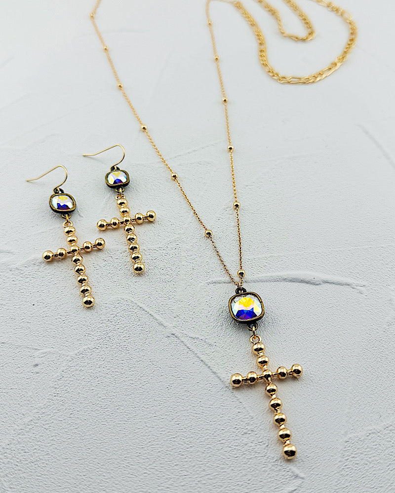 Teresa is a classic! Featuring a lightweight, long golden chain with iridescent swarovski crystal cushion cut pendant & beaded cross dangle. 36" + 2" pendant. We have earrings to match!