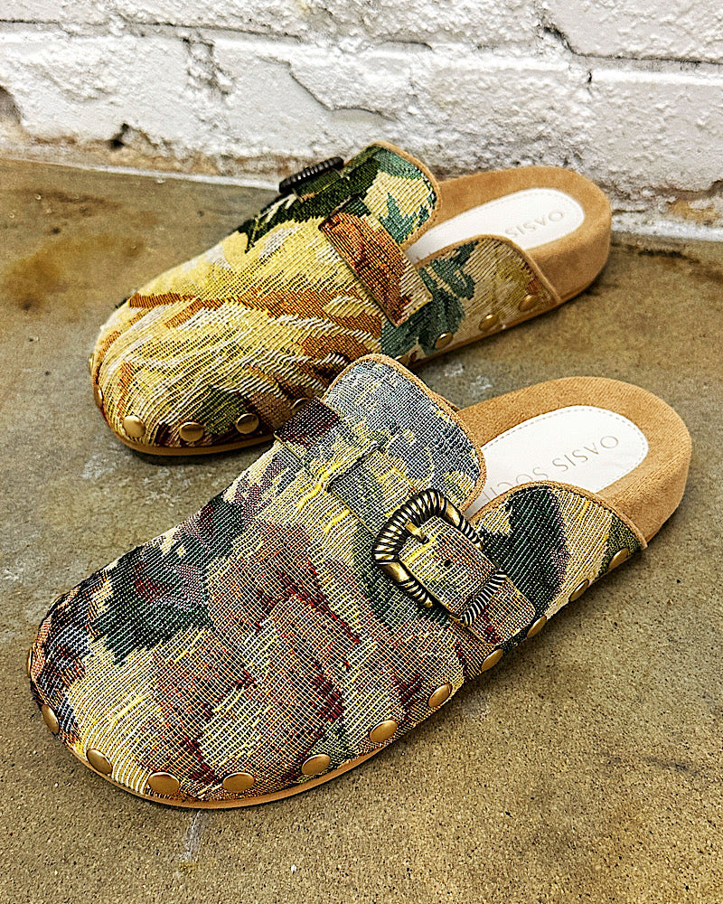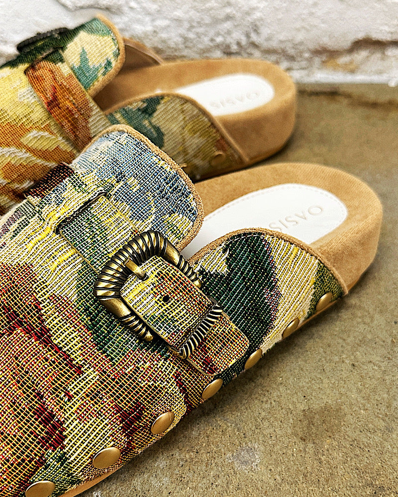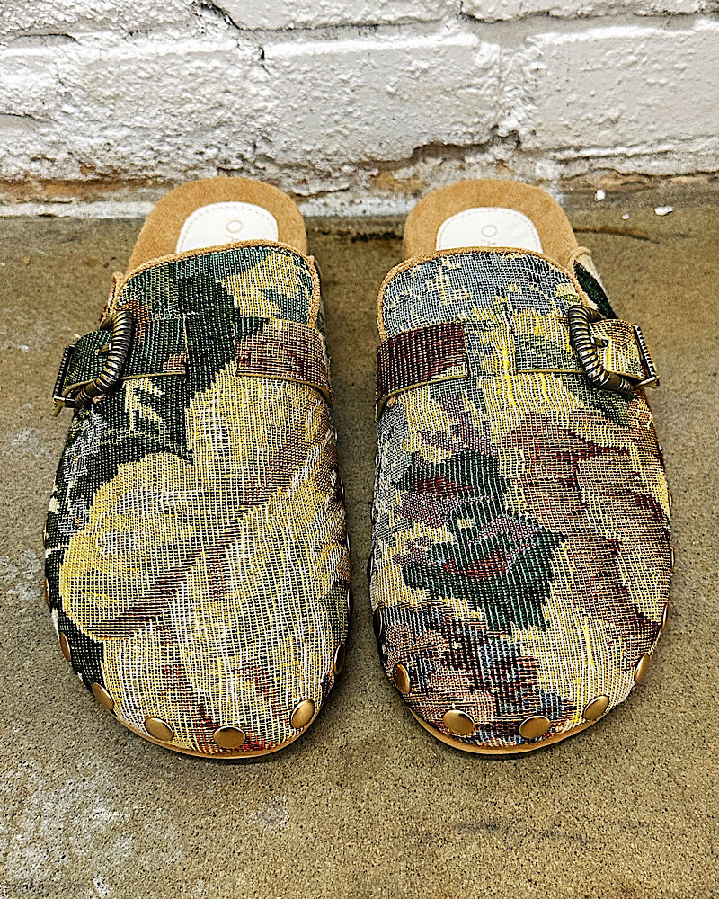 Slip into storybook style with the TESSA TAPESTRY CLOG - where cozy meets couture. Wrapped in vintage floral fabric with soft muted tones and gold stud accents, these shoes are a love letter to old-world charm. The adjustable buckle and cushioned footbed offer effortless comfort, while the bold texture adds a touch of timeless elegance.
