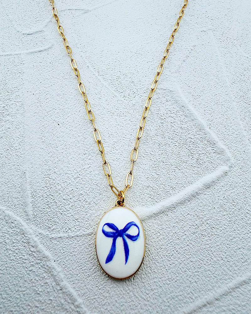 A sweet addition to your jewelry collection. Featuring a golden dainty paper chain with enamel oval pendant accented with a delicate blue bow. Adjustable from 16-19"