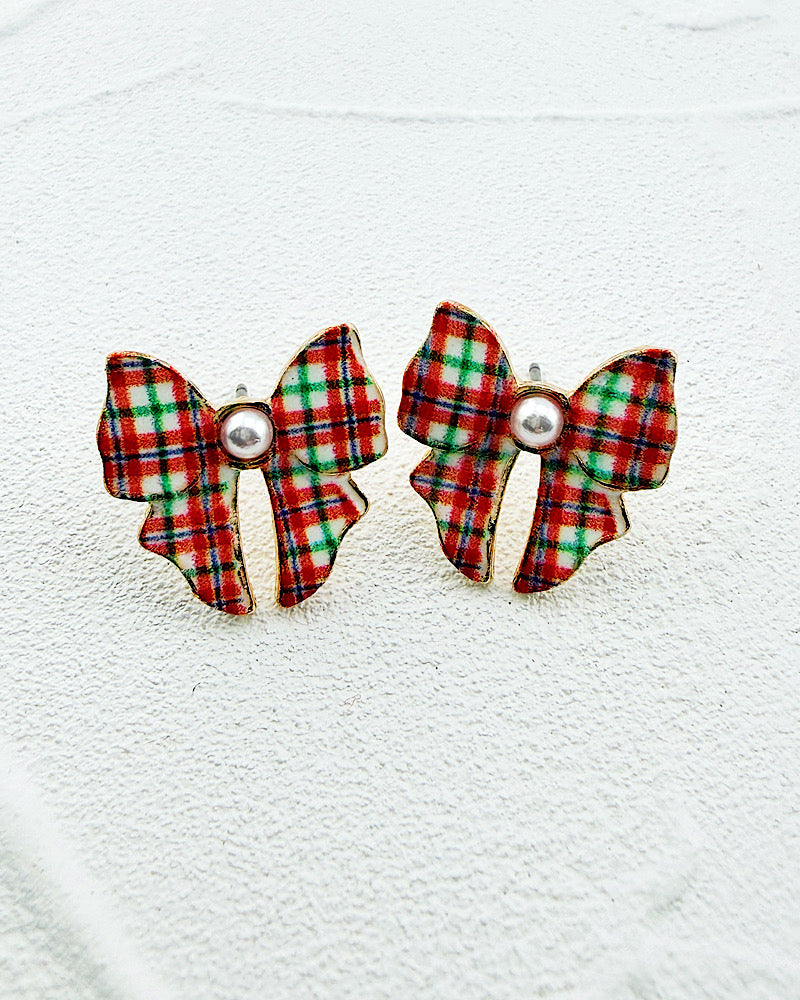 Sweet & dainty golden bows with an enamel plaid overlay & pearl accent. Post style, 5/8"