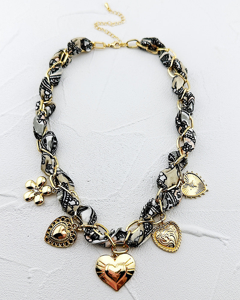 Scarf necklaces are undeniably chic! This woven scarf & chain necklaces is accented with girly heart charms. Adjustable from 14-17"