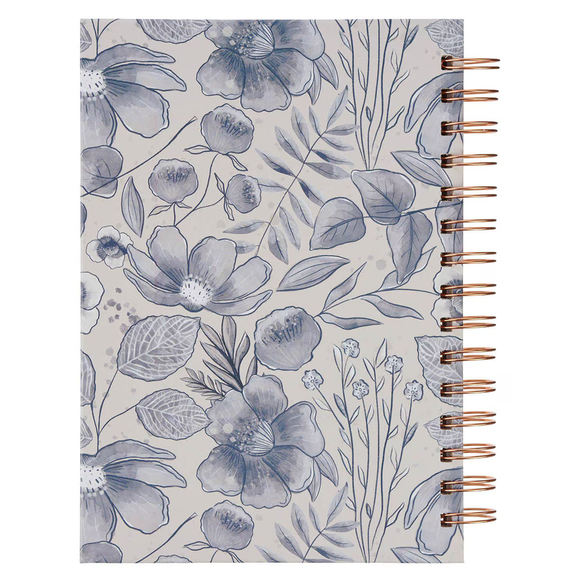 The delicate botanical sketches continue across the back cover, and on the inside, a blue bloom peeks from the outer edge of each page. The rose-gold double O-wire binding makes the journal easy to open and keeps it flat for comfortable writing. Inside, 192 lined pages provide space to record prayers, notes, or personal reflections, each page paired with a Bible verse.