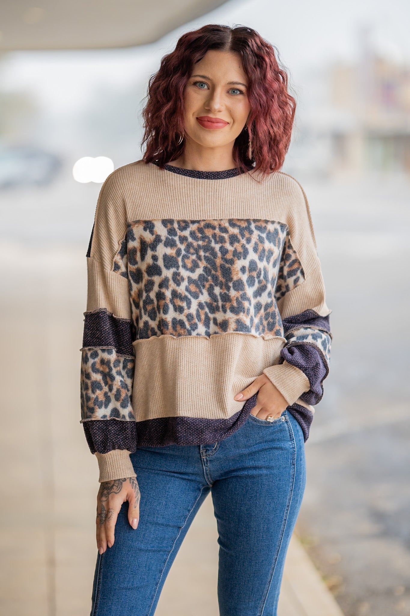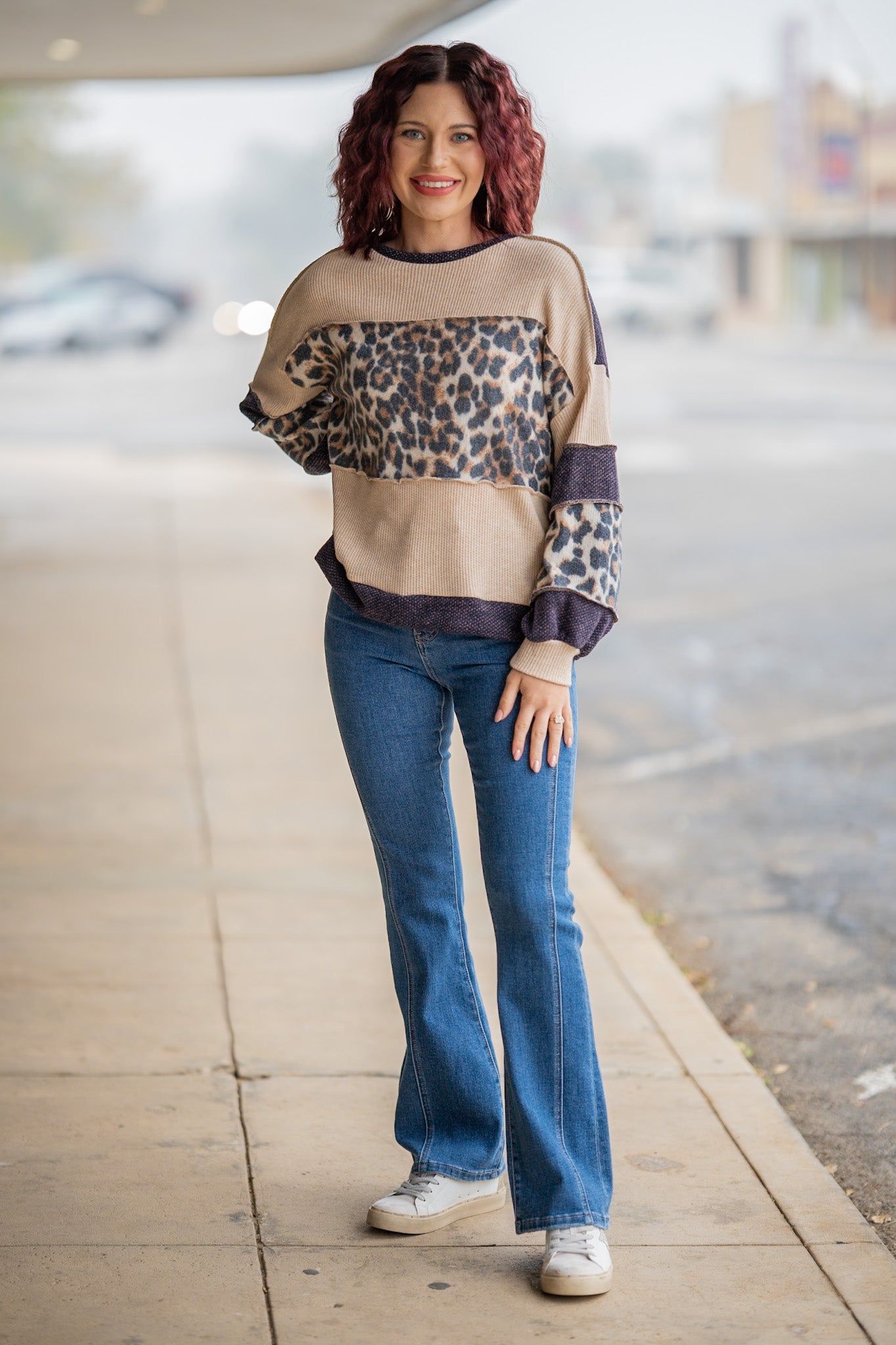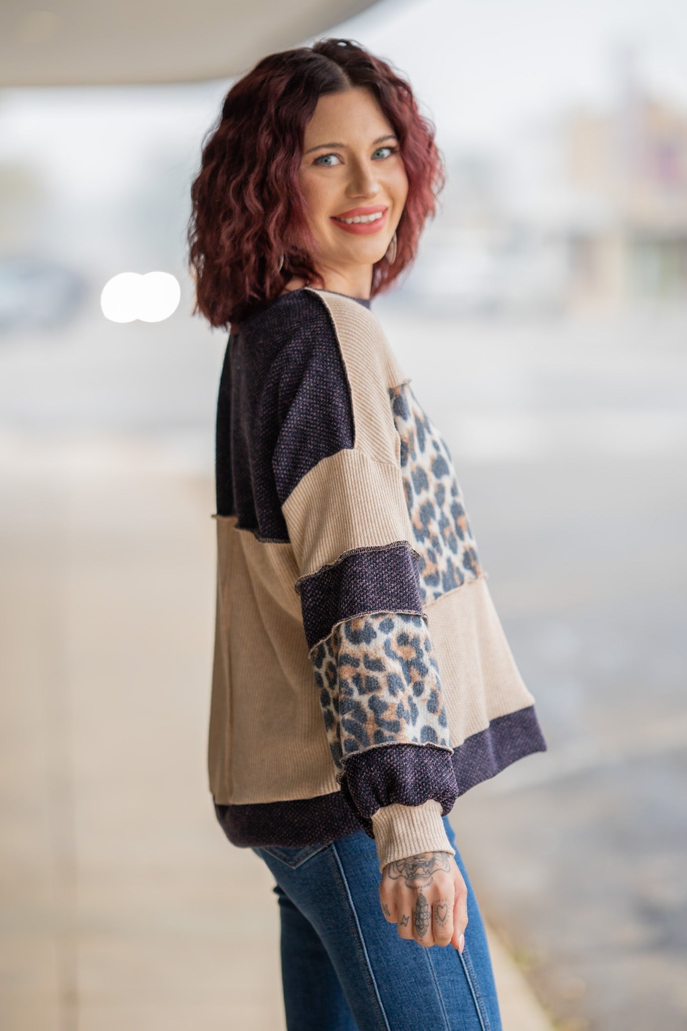 Velma is the most comfortable top you will wear! Soft waffle knit style fabric with leopard accents!