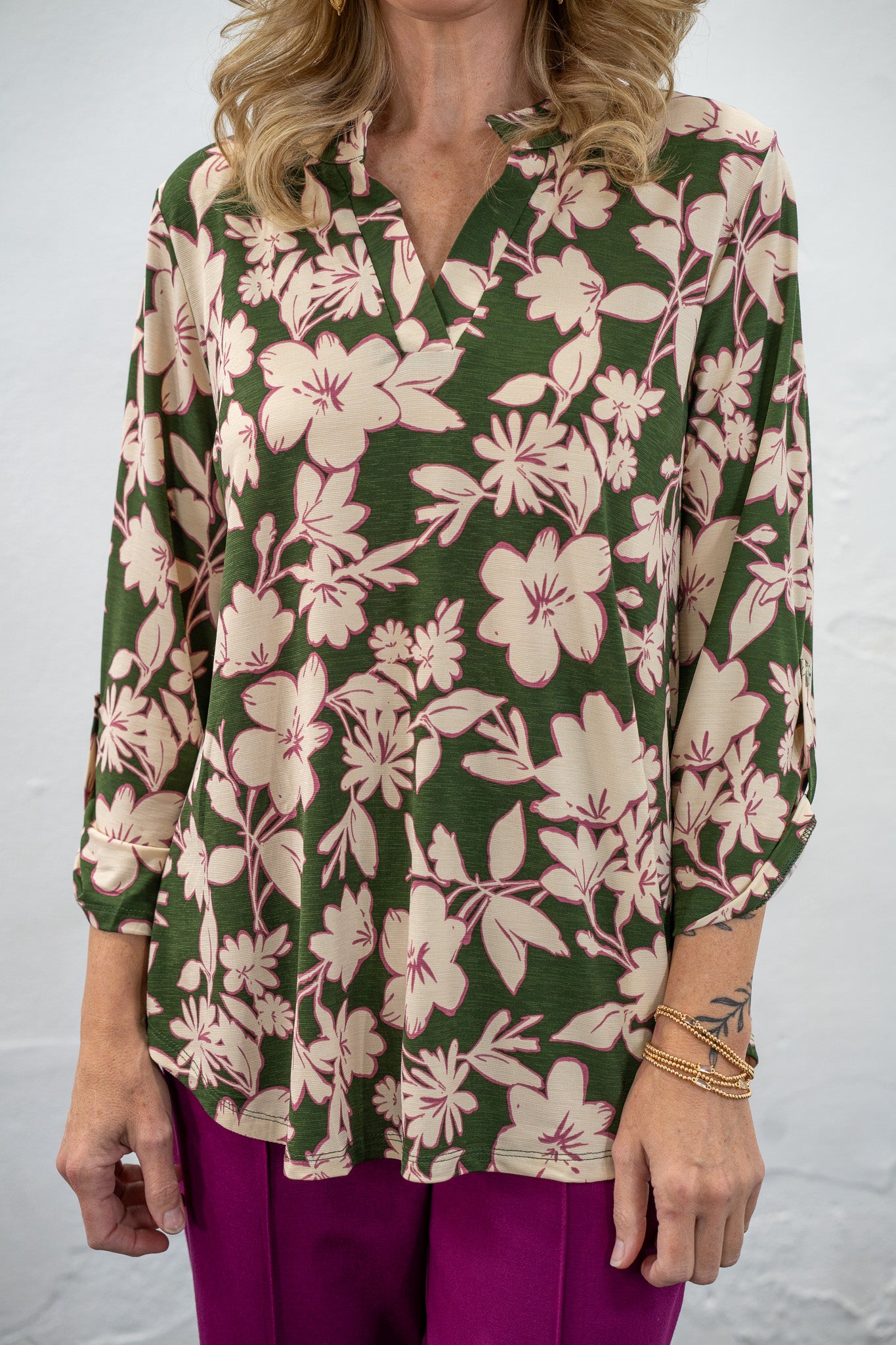 V-neckline, stunning florals and 3/4 sleeves with a gathered button!