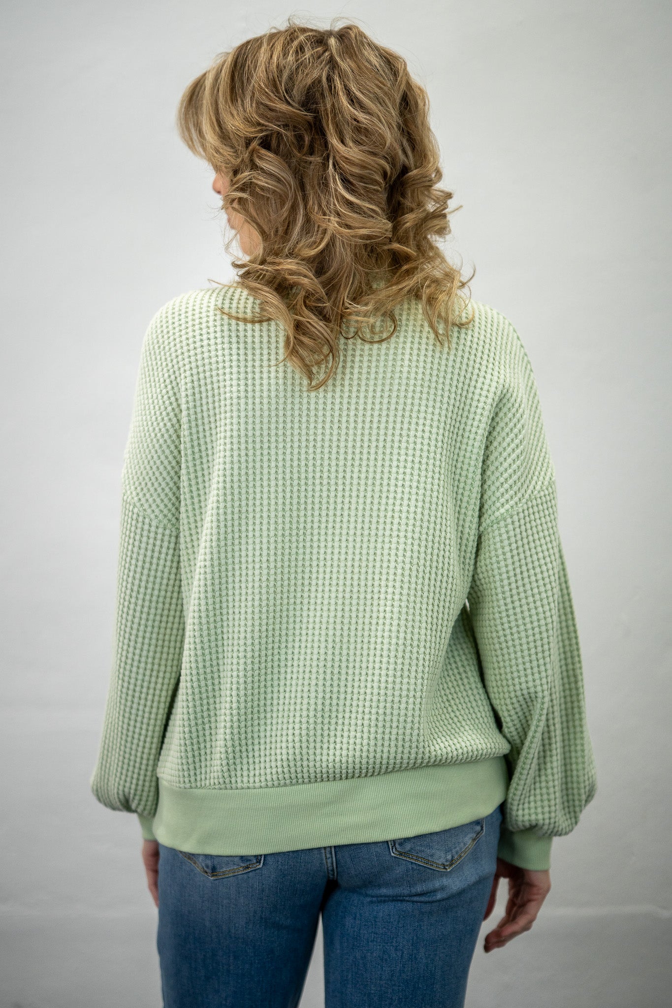 Button snap v-neckline with ribbed hemline around the bottom and sleeves.