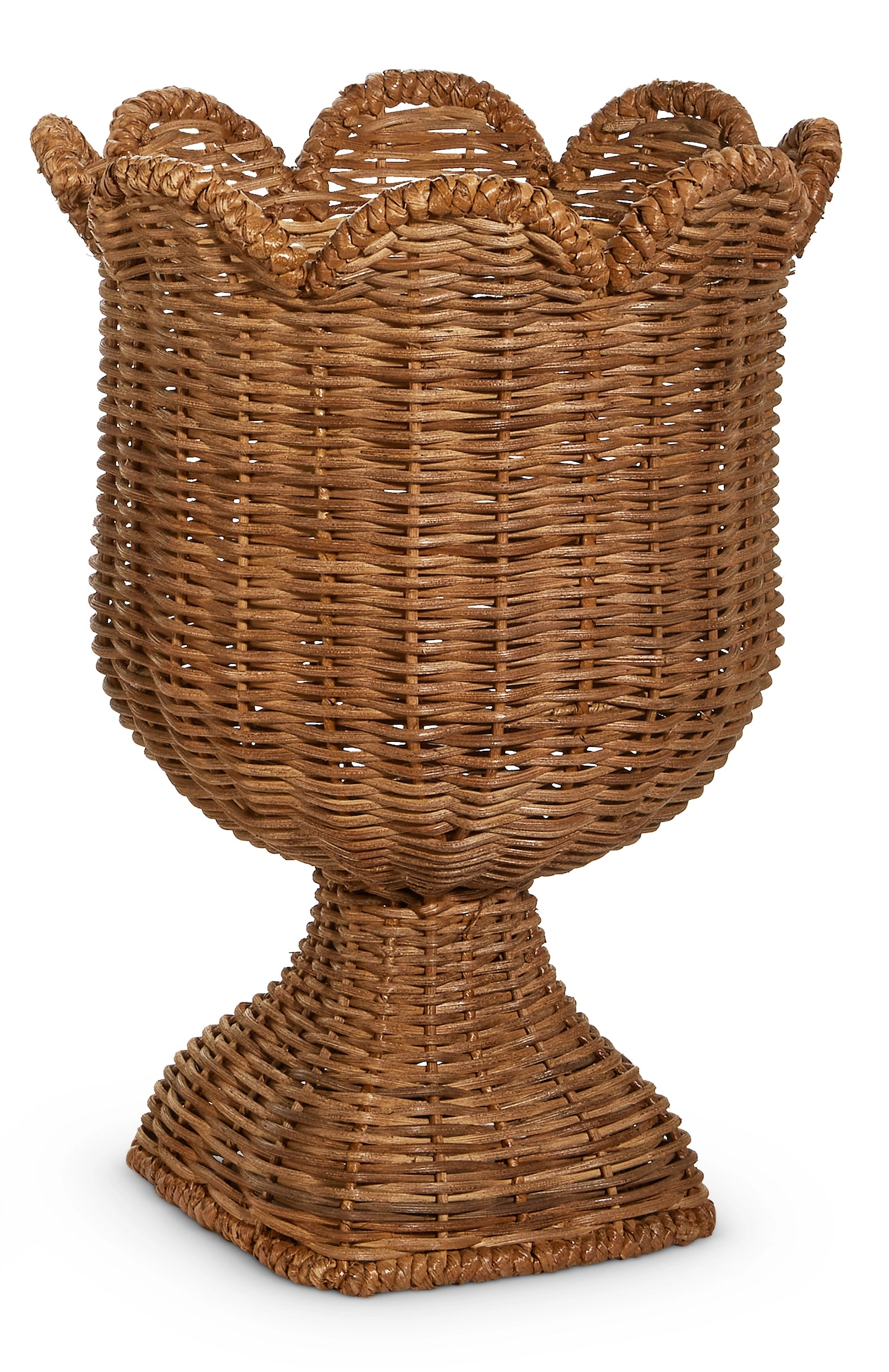 These woven scalloped urns feature a beautifully textured design with a soft scallop edges for added visual interest. Crafted in a natural woven finish, these urns bring warmth and rustic charm to any space. The two sizes offer versatile styling options.