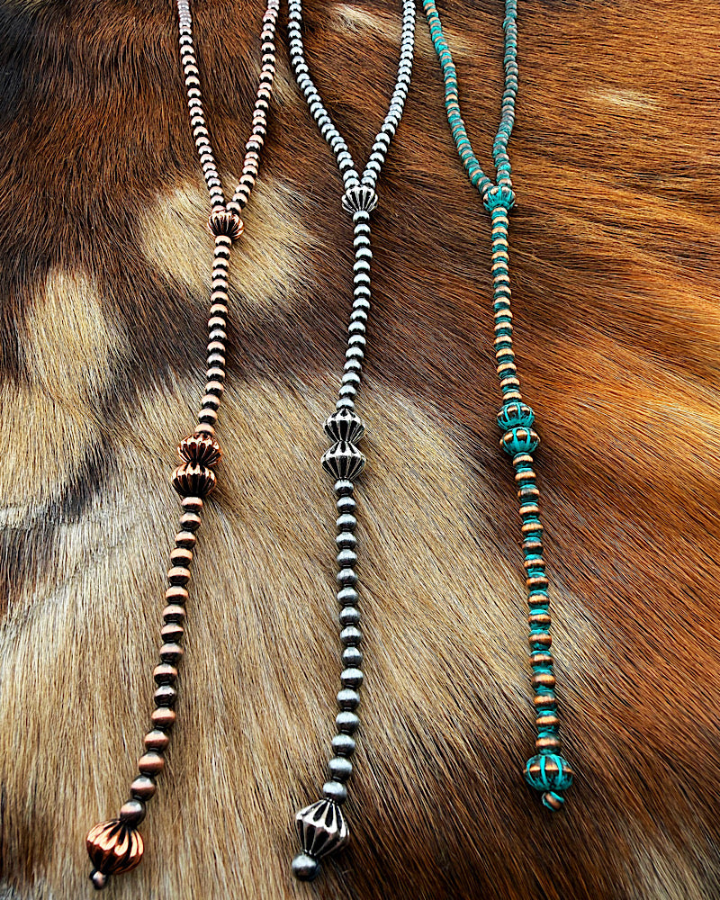The western Y necklace makes a great layering piece. Beaded with lightweight navajo pearls & concho beads. Available in pewter, copper & patina. Adjustable from 18-21"