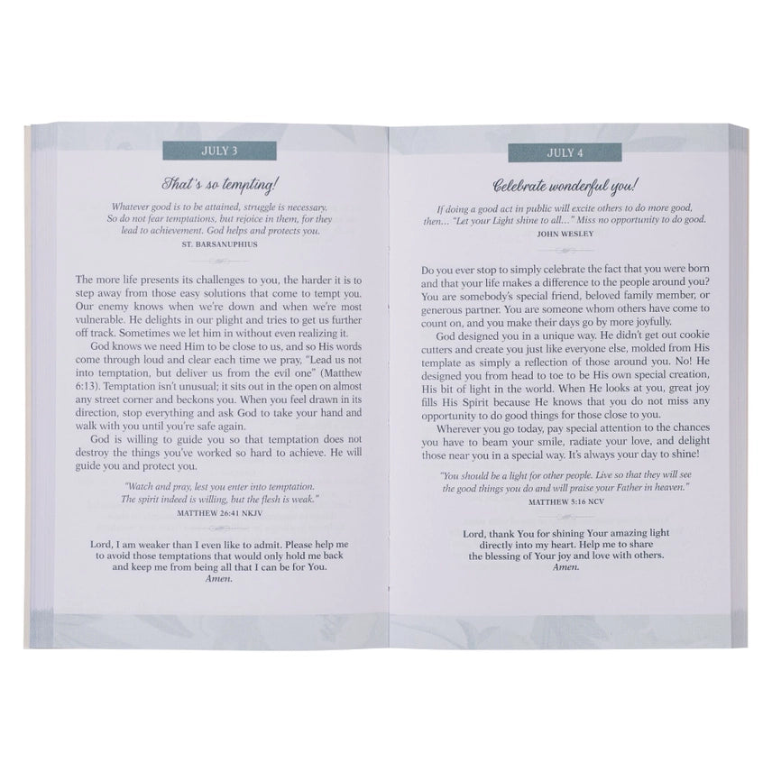 The You Are Blessed Softcover Devotional Book by Karen Moore is the perfect devotional book to remind you of how special and loved you are. This devotional shares the message that you are God's beloved and His rare and precious treasure. Blooming pink peonies design, UV-varnish accents, Pink-foiled title, You Are Blessed, Softcover, One-color interior, 388 pages, 366 devotions.